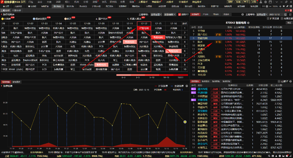 智能电网:涨停棱镜观察,智能电网12月12号出现涨停高潮,炒作涨停17家,资金流入143亿。目前处在风口浪尖回踩阶段,可以结合风口浪尖T+3模型去寻找短线回踩低吸的机会。