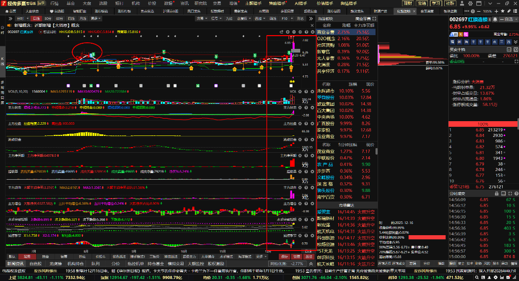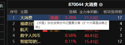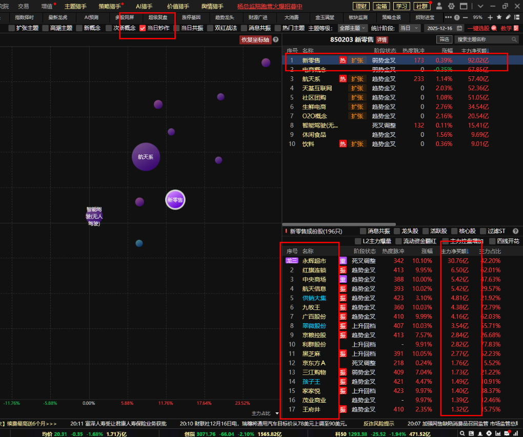 通过热点纵览可以快速去判断每天有那些细分方向的炒作机会。通过资金进行排名,可以看到资金流入靠前接近百亿的只有大消费细分新零售这个概念。