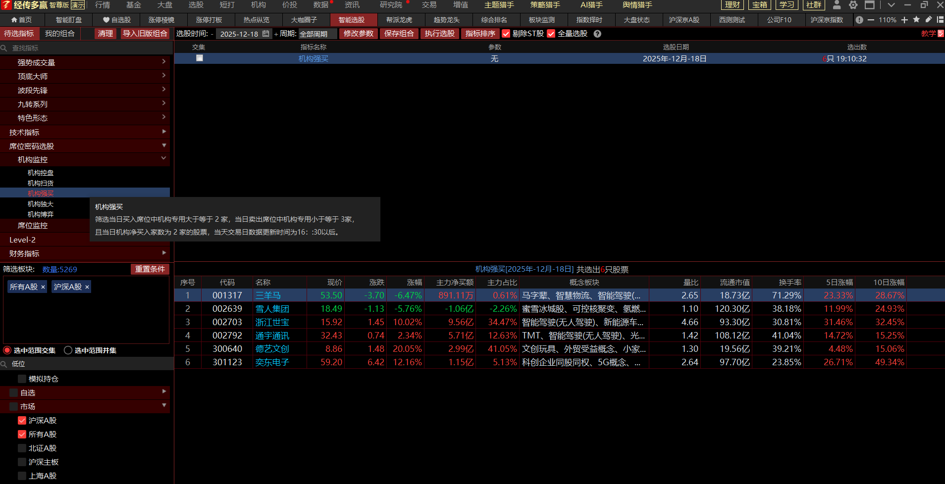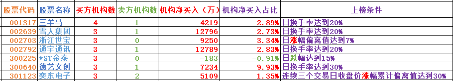 6.每日席位解读(主要是对个股的席位和软件指标进行一些解读,更好的理解席位的用法和软件信号,非荐股,对于机构席位大幅买入的品种,从逻辑上来讲是机构看好的预期,对这类品种需引起思考,对于选取做点评个股的逻辑主要是以下几点:机构净参与家数、机构席位净买金额、净买金额占比等)。