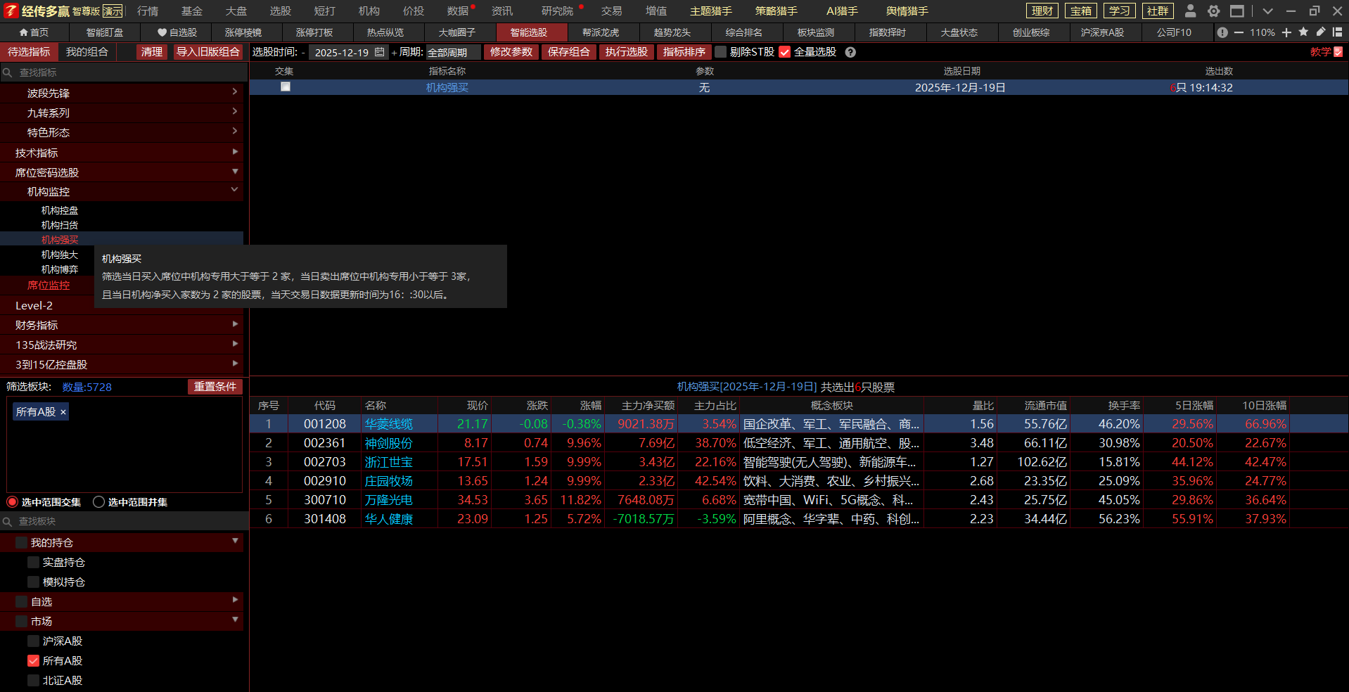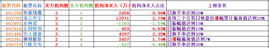 6.每日席位解读(主要是对个股的席位和软件指标进行一些解读,更好的理解席位的用法和软件信号,非荐股,对于机构席位大幅买入的品种,从逻辑上来讲是机构看好的预期,对这类品种需引起思考,对于选取做点评个股的逻辑主要是以下几点:机构净参与家数、机构席位净买金额、净买金额占比等)。