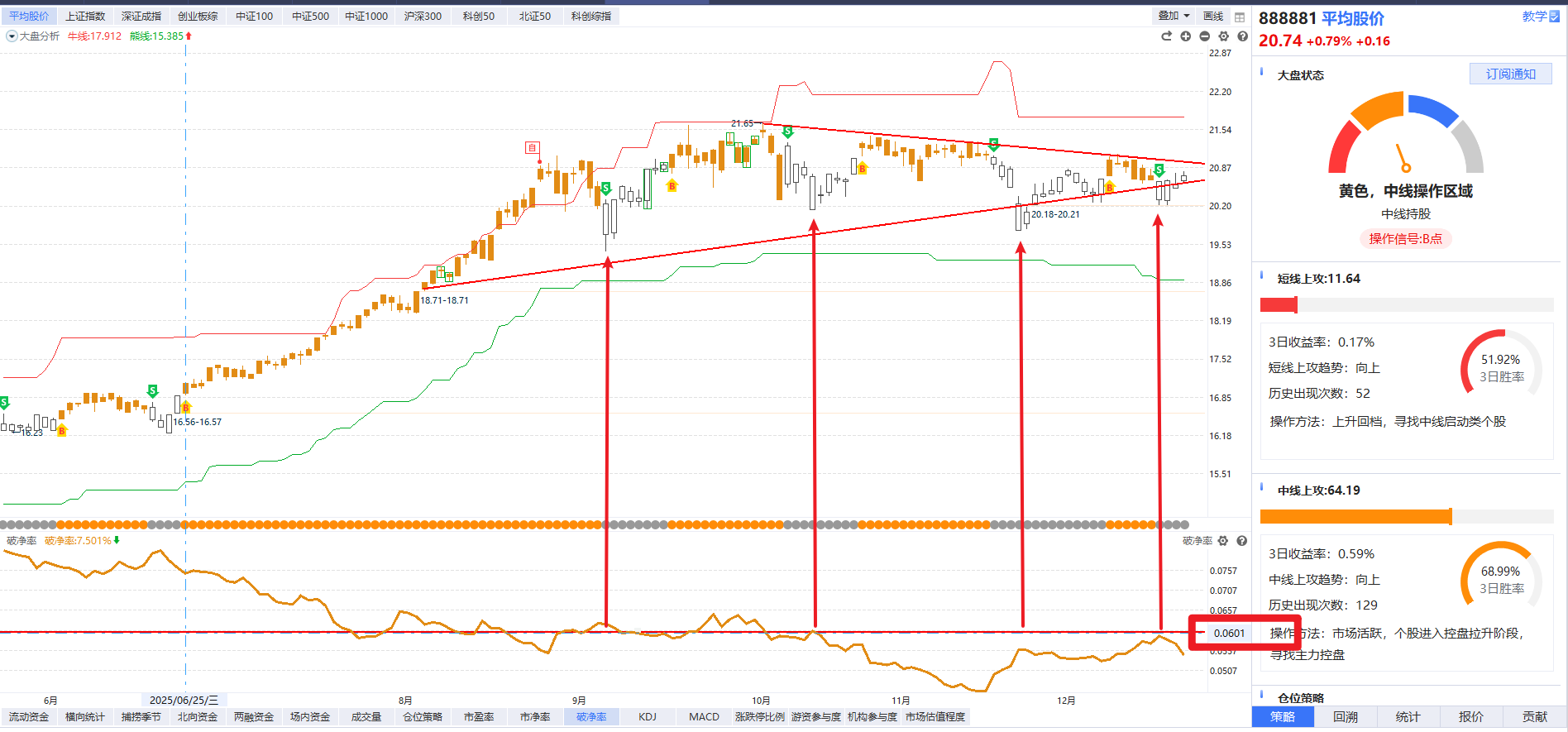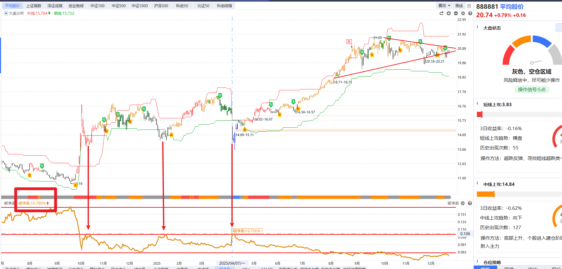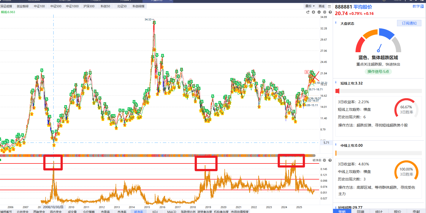 破净股板块指标的角度海洋状态入水且出现金叉,捕捞季节底背离金叉,趋势成立三要素当中的【海洋状态入水金叉+底背离金叉+珍惜下跌】,因此可以看作破净股板块概念有反转预期了,也就是破净率这个曲线大概率见底了,然后约等于市场见底,接下来就是趋势反转的上涨预期。