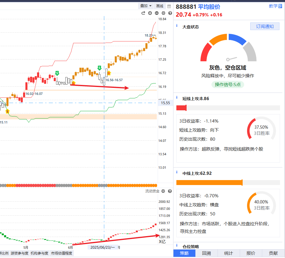 第一种情况:突破上轨趋势线+流动资金翻红+B点出现,进攻信号,平均股价预期到牛线附近才有压力,5%的涨幅空间,主题赚钱效应大于30%涨幅。