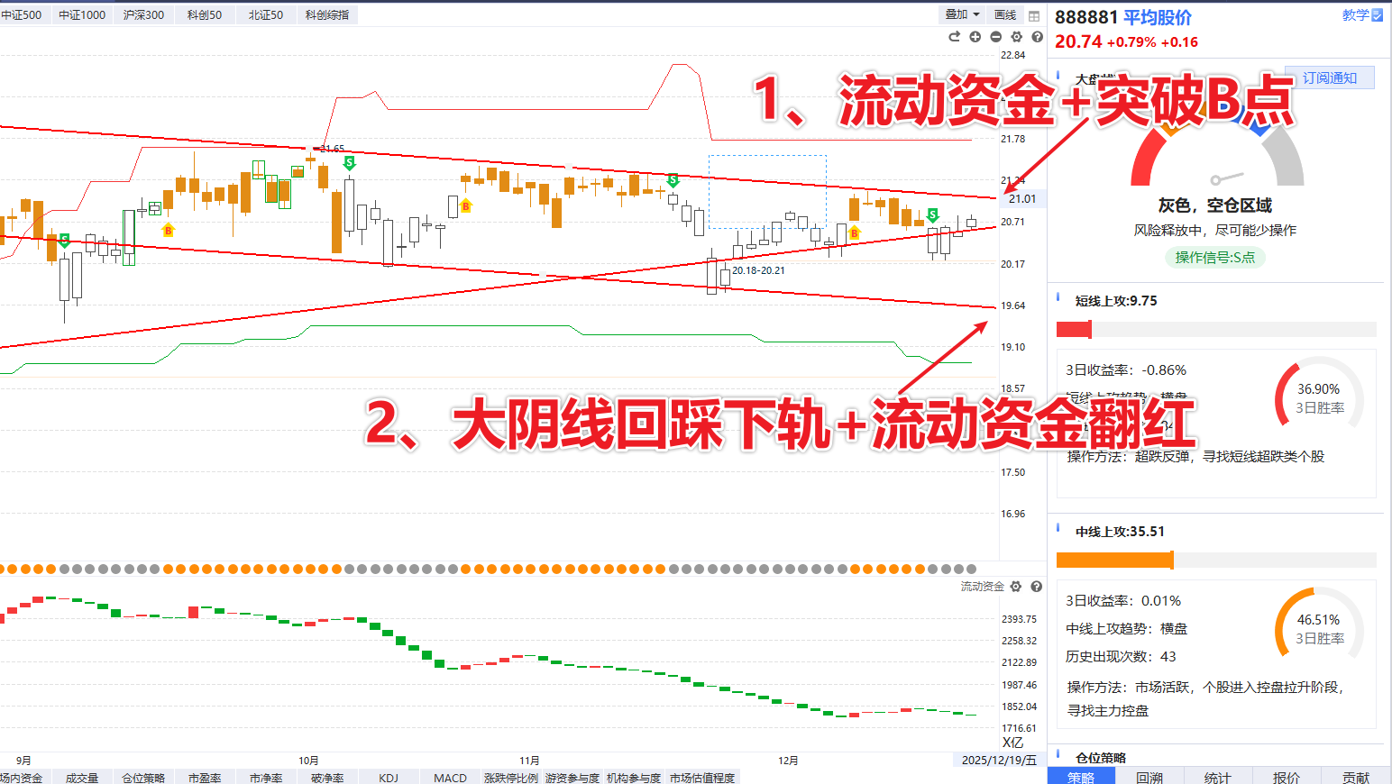 第二种情况:再次跌破三角形,回踩下轨,大阴线越接近底部尾声,重新出现流动资金翻红抄底,进攻信号,B点出现共振主题赚钱效应更好。