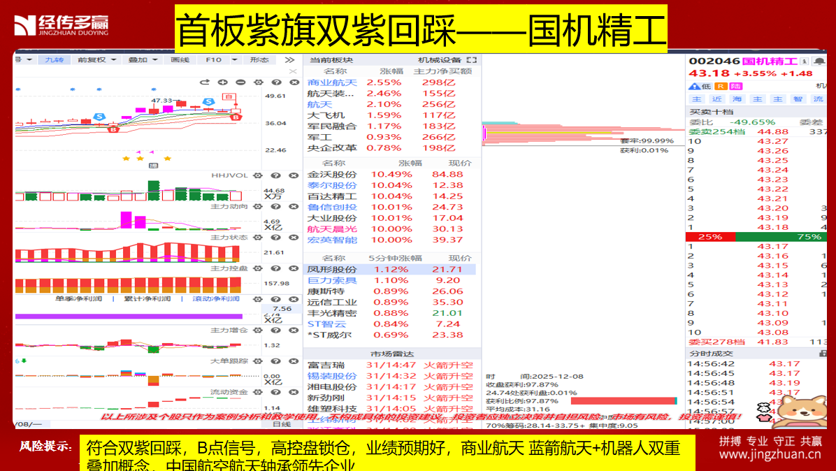 - 盟升电子:为蓝箭提供导航和通信产品,同时服务航天科技集团等“国家队”,客户覆盖全产业链 。 来源公开资料 实盘选股——底部首板紫旗、风口龙头