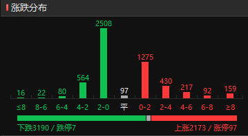 下跌个股3190只,大涨个股159,大跌个股16,赚钱效应良好,涨停板97个,连板23个,二板8个,连板效应良好,最高板8板。