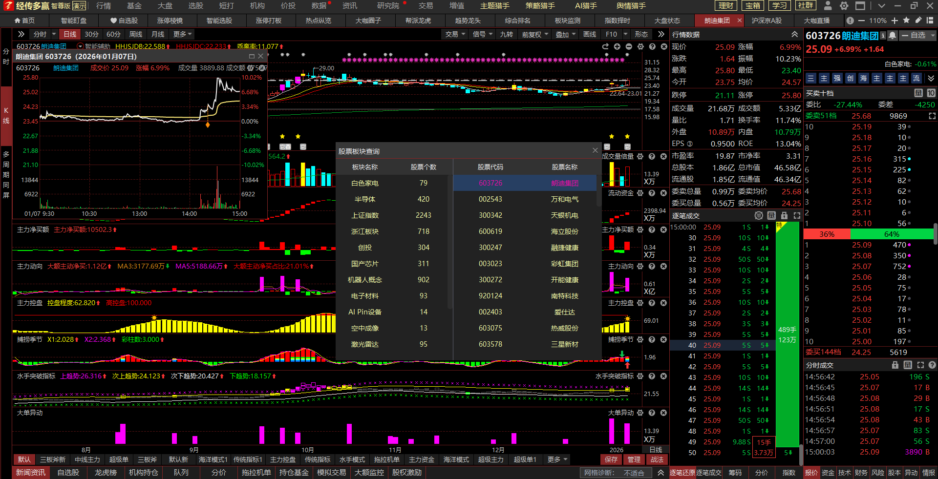通过软件信号和数据显示:朗迪集团,叠加半导体、机器人、激光雷达等主题,股价比较靠近年线,处于绝对位置低位,趋势上多头排列;日线捕捞季节金叉第1根,周线金叉第3根;今日股价冲击涨停,且创近2月新高;近期频繁出现大单异动,符合仙人指路擒涨停模型