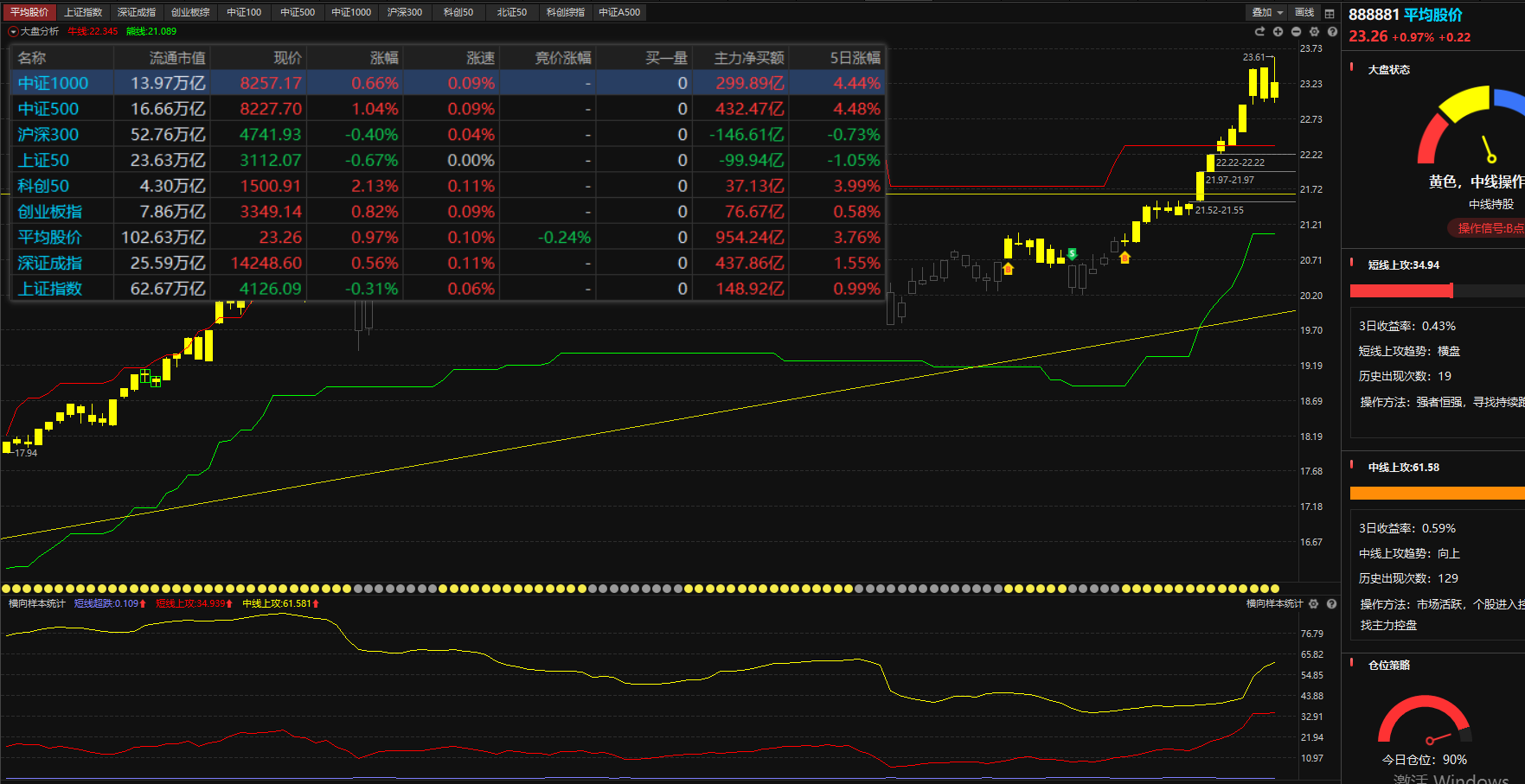 指数涨跌不一,表现最好的是科创50上涨了2.13%,表现最差的是上证50下跌了0.67%。 平均股价信号黄色B点、流动资金第16天翻红、牛线走平、熊线走平、中线上攻61.5向上、短线上攻34.9向上,捕捞季节死叉第2天。 两市量能放大2904亿。