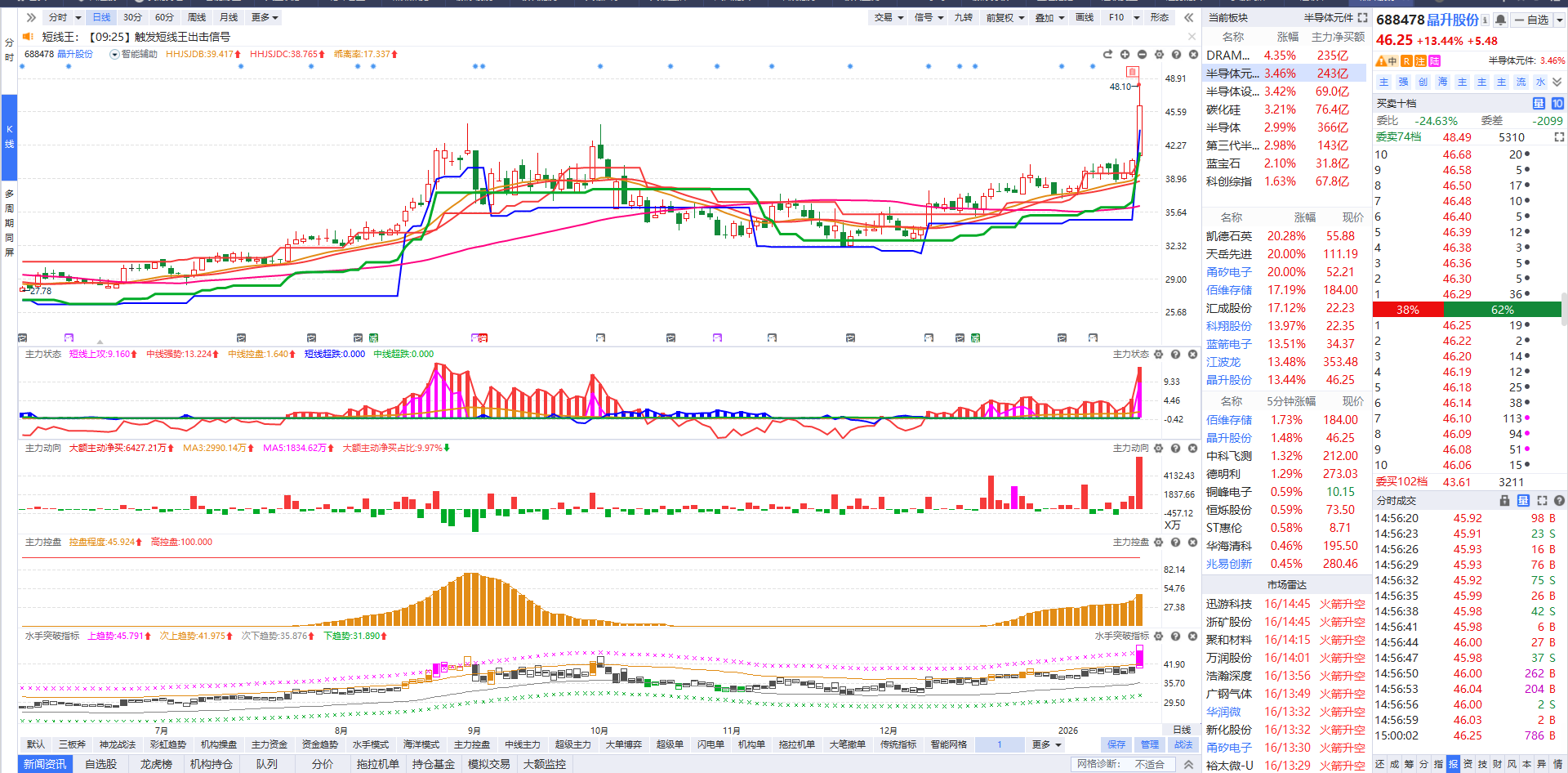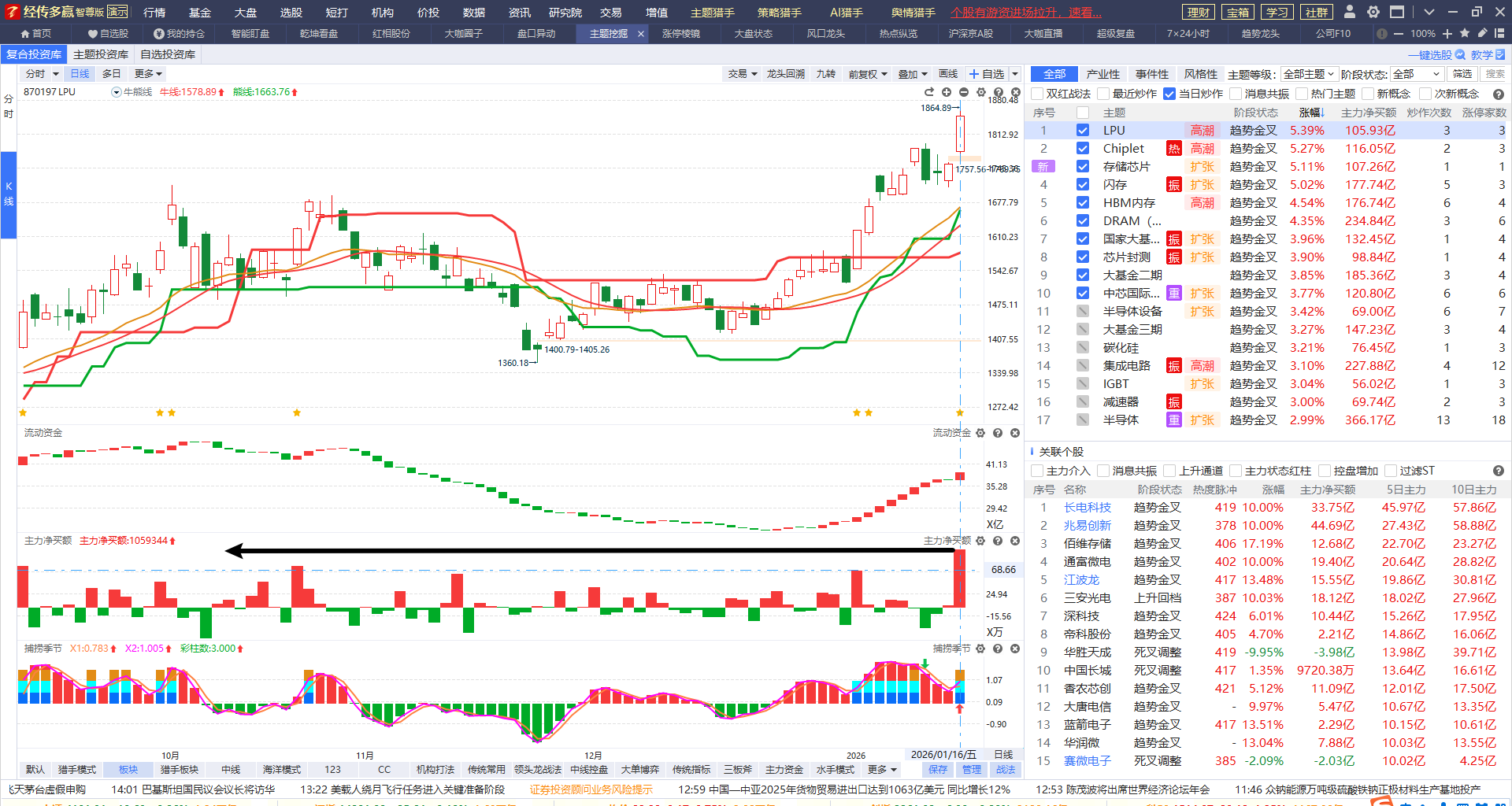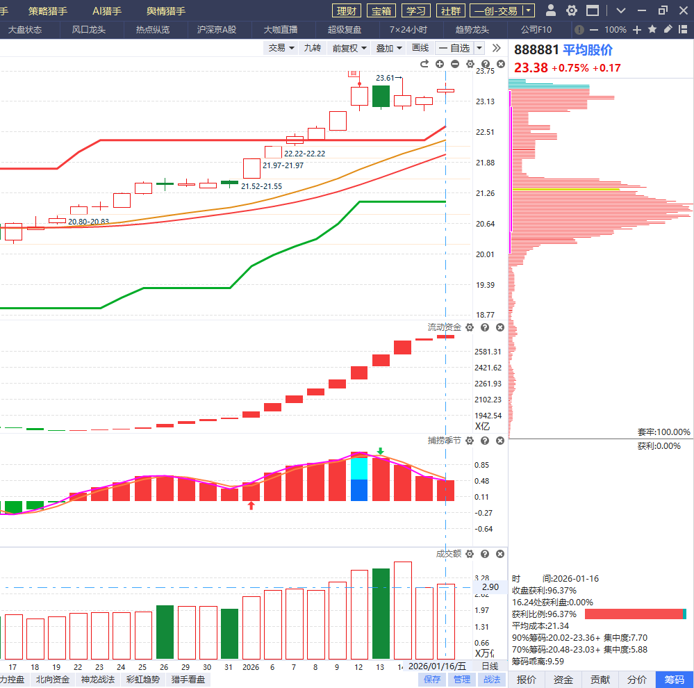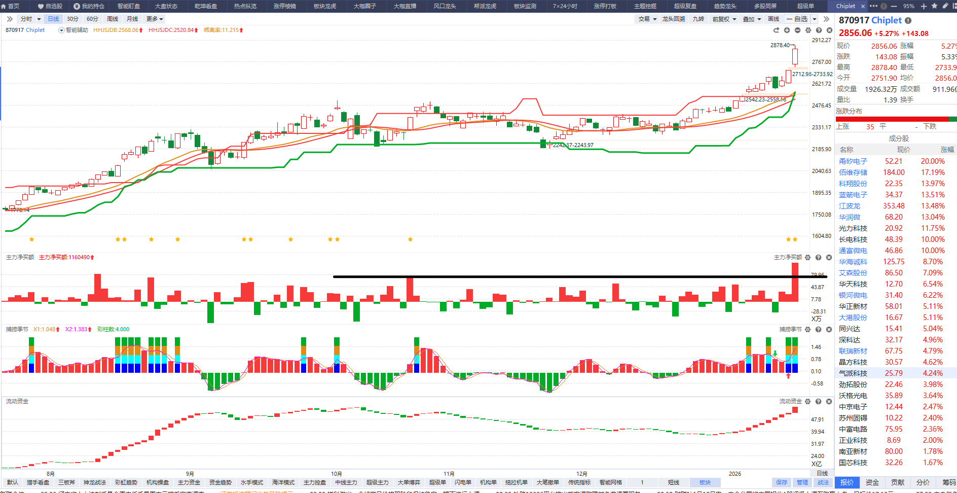 Chiplet符合【炒作+资金异动+流动资金翻红+股价在牛熊线上】,并且在1.16号当天熊线上移突破牛线,可以关注板块异动是否持续的机会。