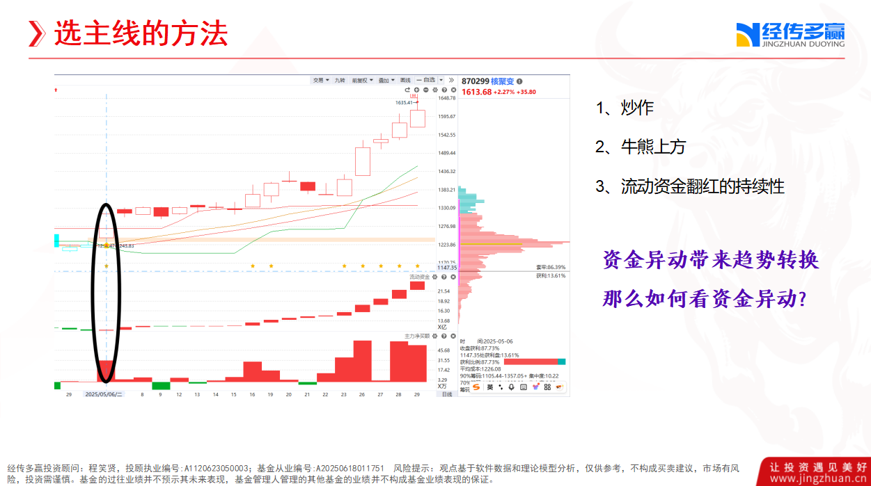选板块、选主线的方法,我们一直没有改变:重要资金异动、重在趋势突破、重在炒作利好。