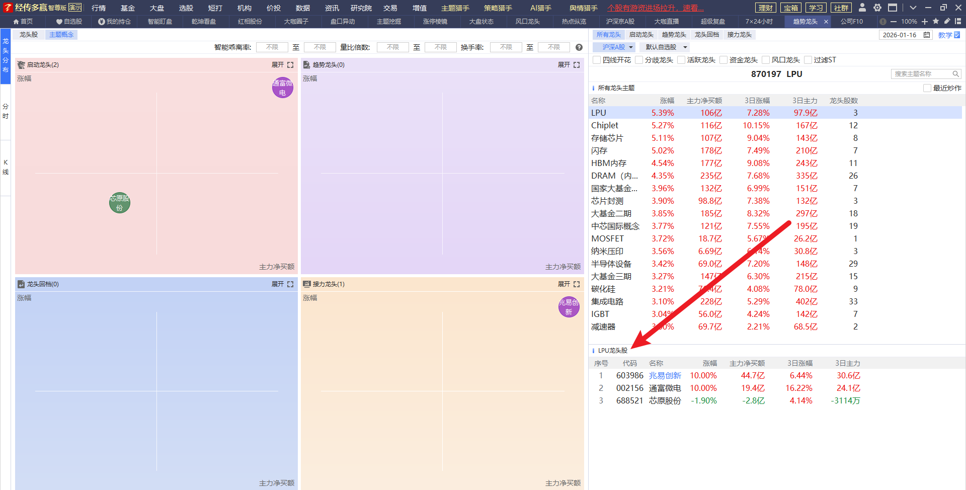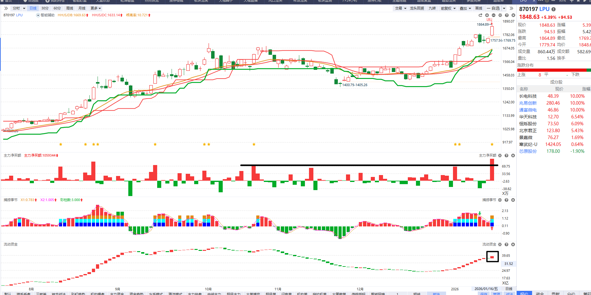 1.16号,LPU符合【炒作+资金异动+流动资金翻红+股价在牛熊线上】,同时这个板块在近期突破了前期平台,可以关注板块异动是否持续的机会。