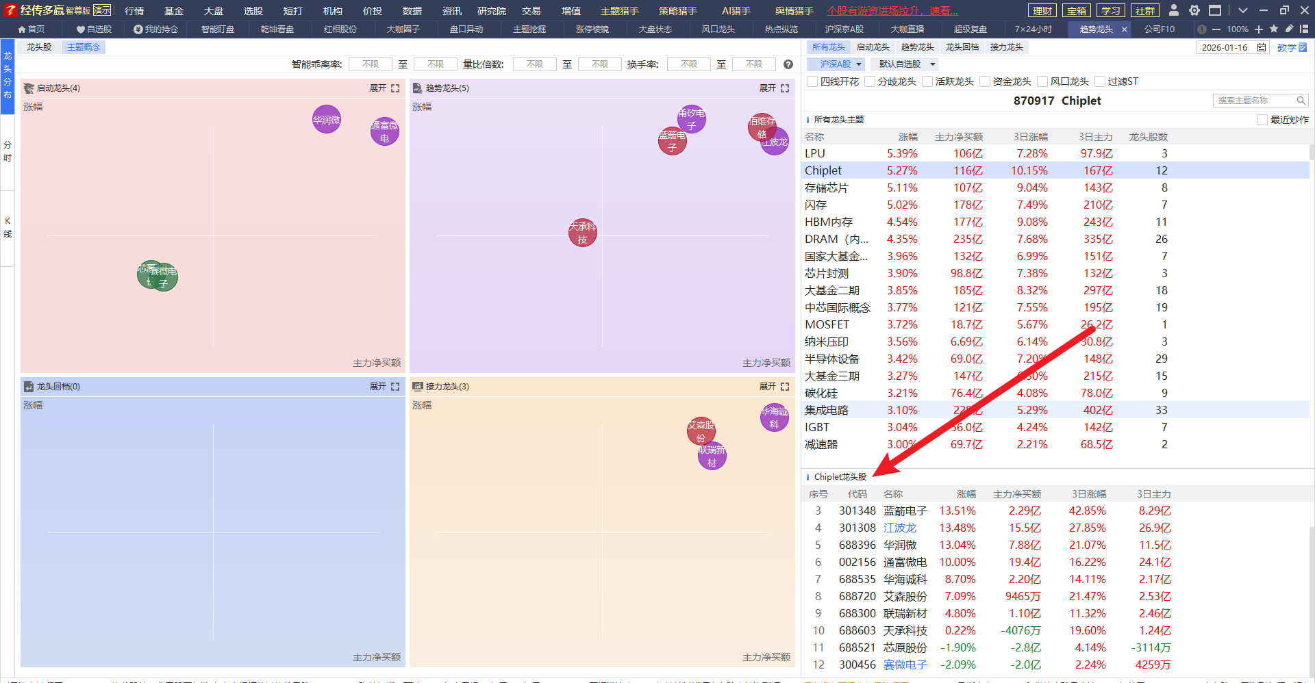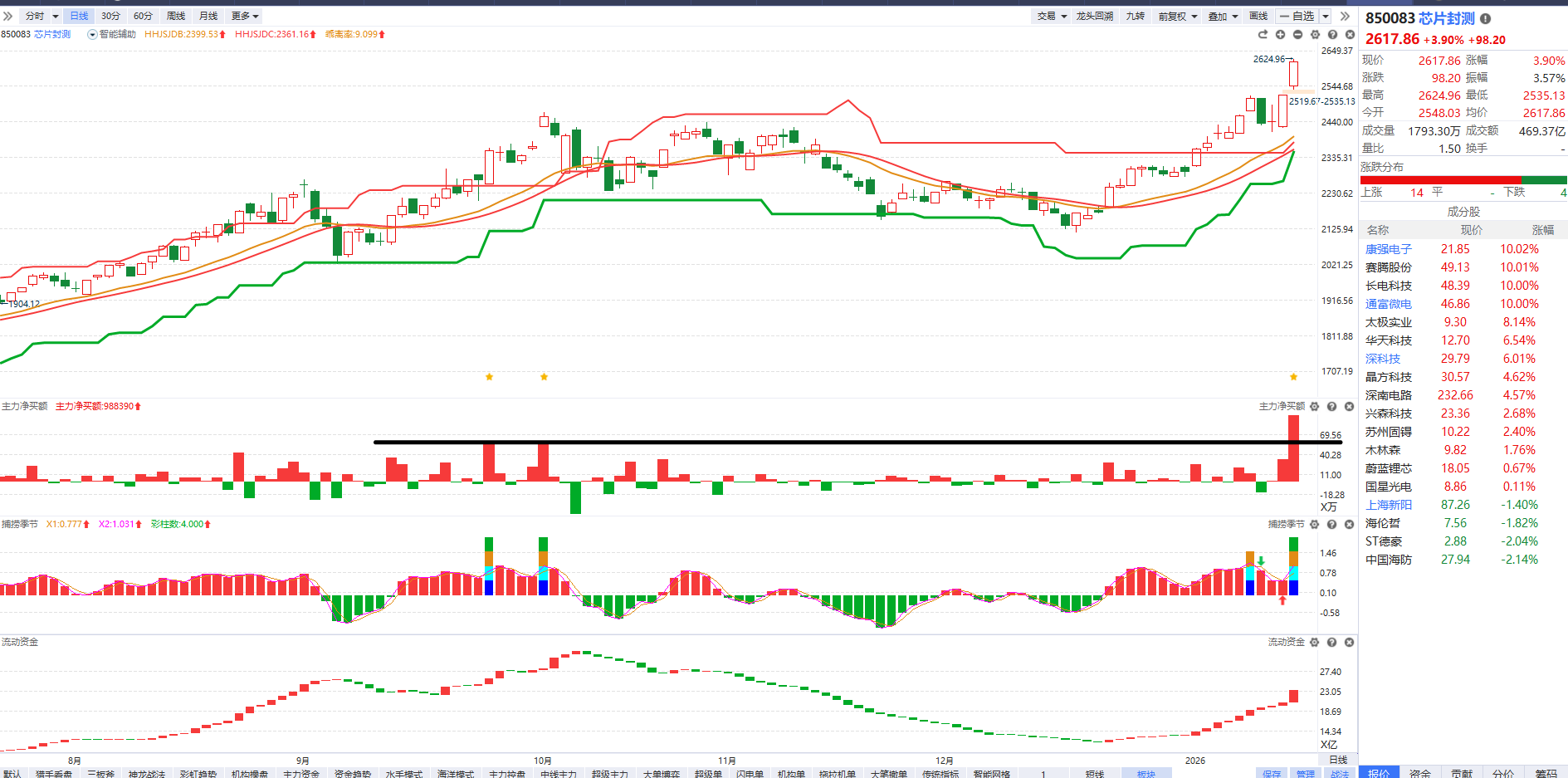 芯片封测,也是明显的资金异动,符合【炒作+资金异动+流动资金翻红+股价在牛熊线上】,可以关注板块异动是否持续的机会。当然,在1.16号发生资金异动的不止有这四个板块,但是其他的一些板块,有的已经不算是首次异动,有的异动不明显,有的是近期的涨幅较高,我们要做肯定是做异动更加明显、价格刚突破平台不久的。