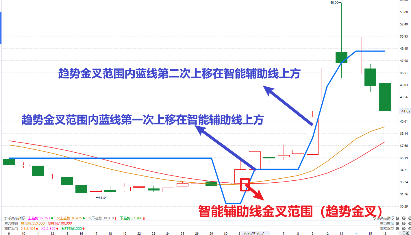 按照上图的解释,优先选择“趋势金叉范围内蓝线第一次上移在智能辅助线上方”,后期则是重点关注回踩的买点信号。(注意:如果蓝线下移出B点,则要等待三天内要蓝线上移到智能辅助线上方)