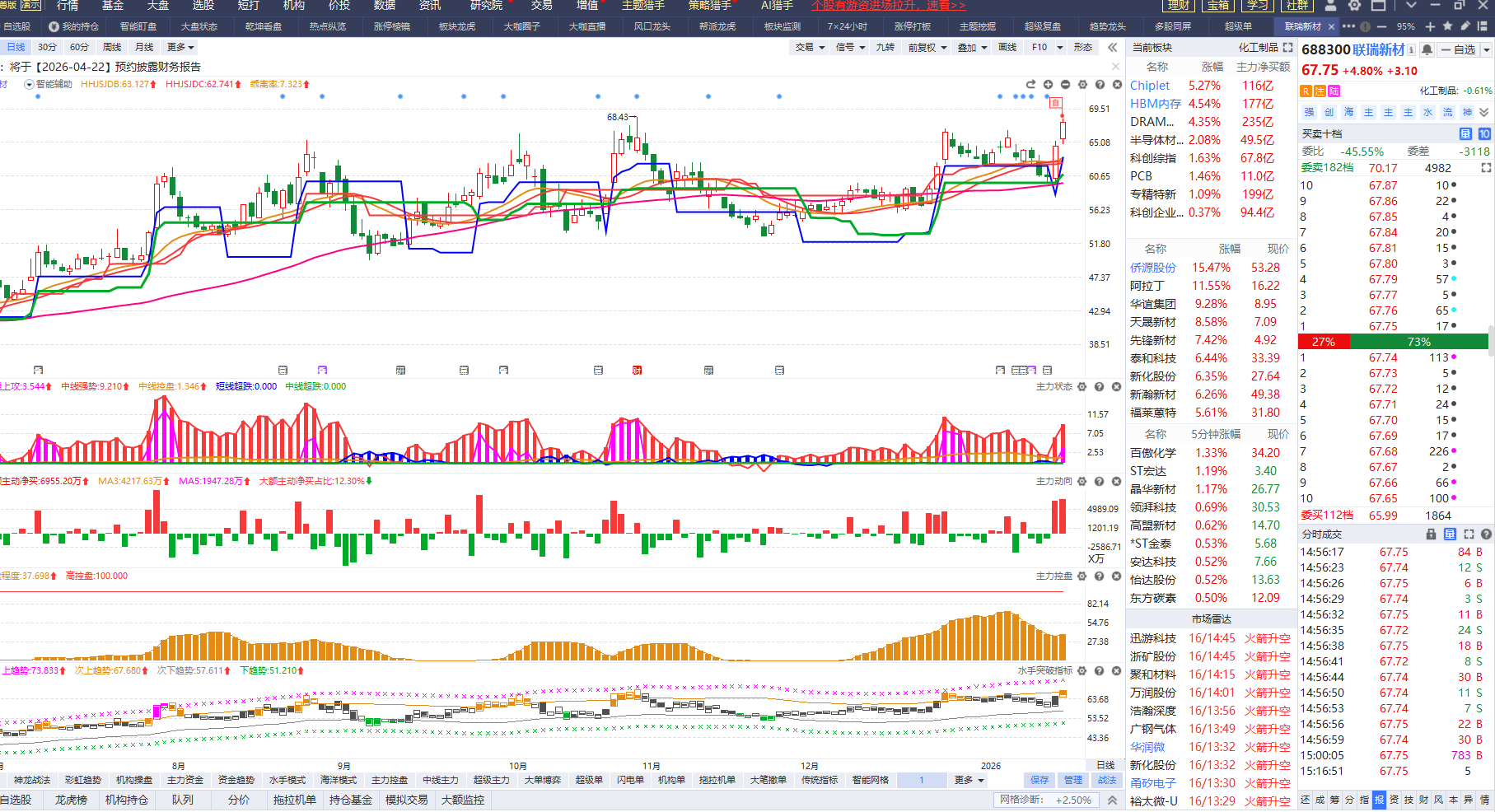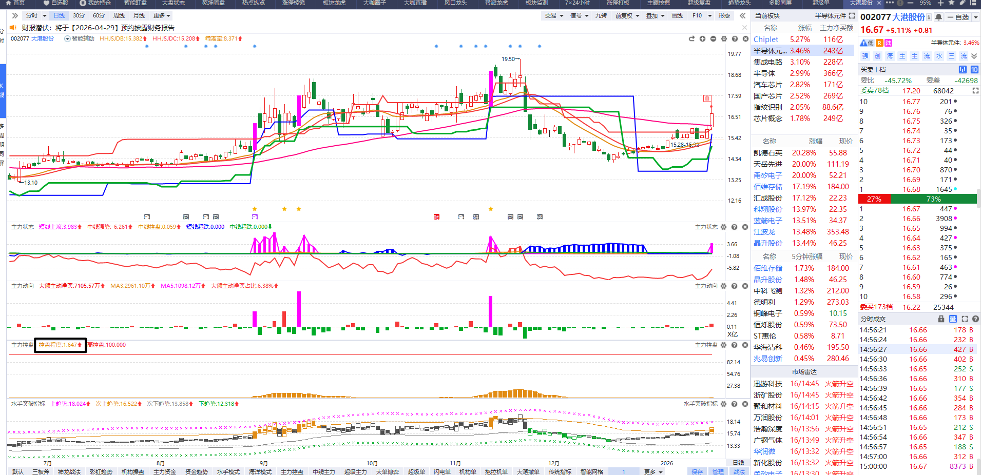 联瑞新材,属于Chiplet+内存,前期反复控盘且控盘增加,主力动向红肥绿瘦,当时有游资进入,双线上移+水手变色第一天。