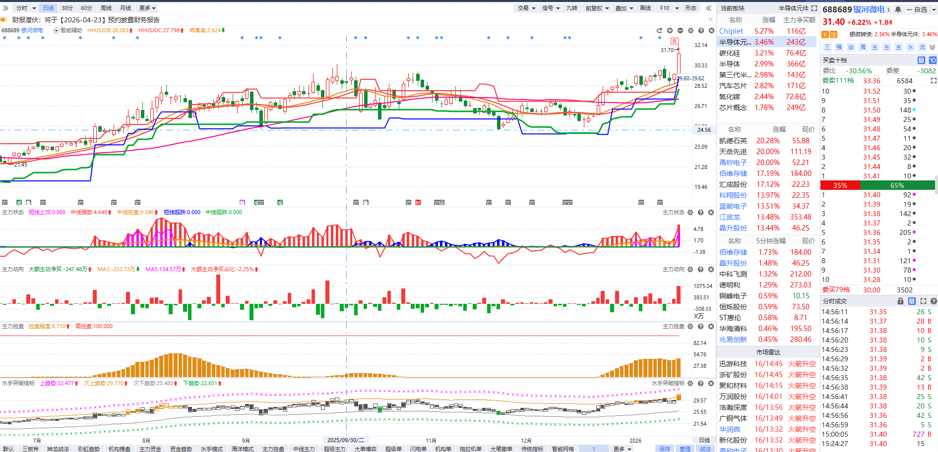 银河微电控盘增加,水手变色第一天,双线上移,资金红肥绿瘦,属于强势区间。