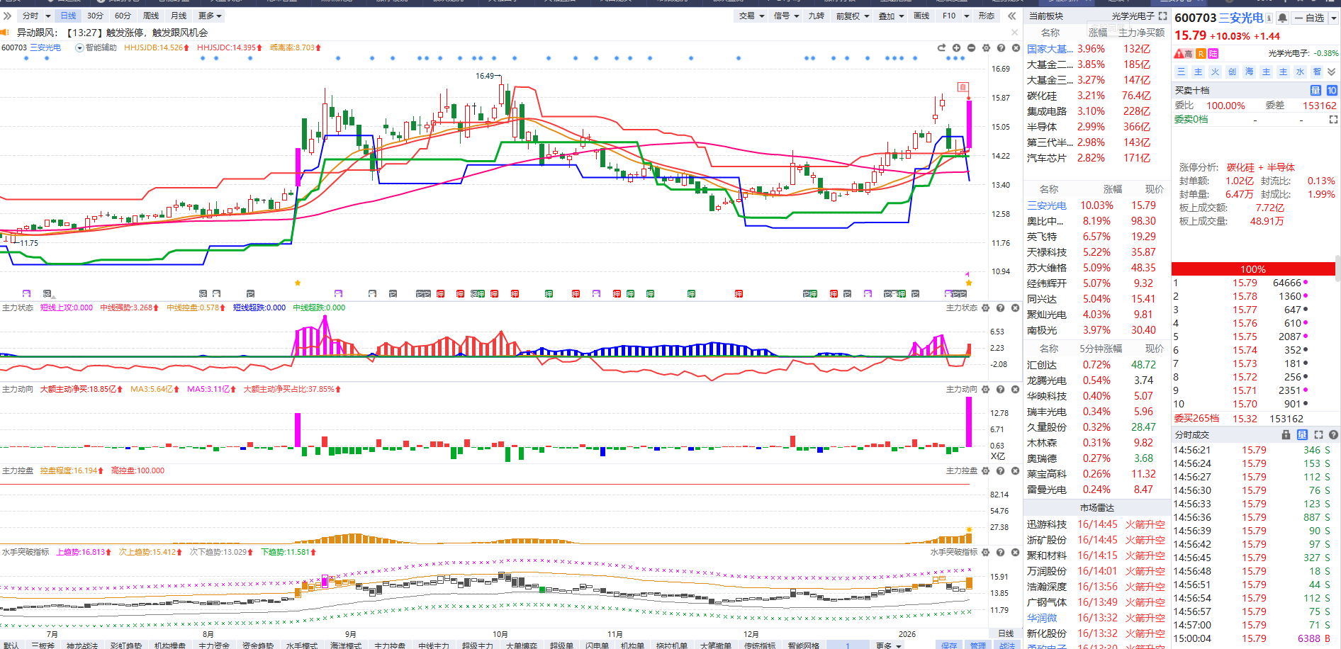 三安光电涨停,主力动向变紫代表有大资金抢筹,关注后面回踩低吸机会。