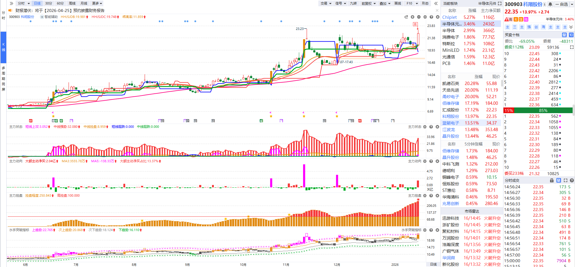 科翔股份控盘增加,水手变色第一天,有游资进场。