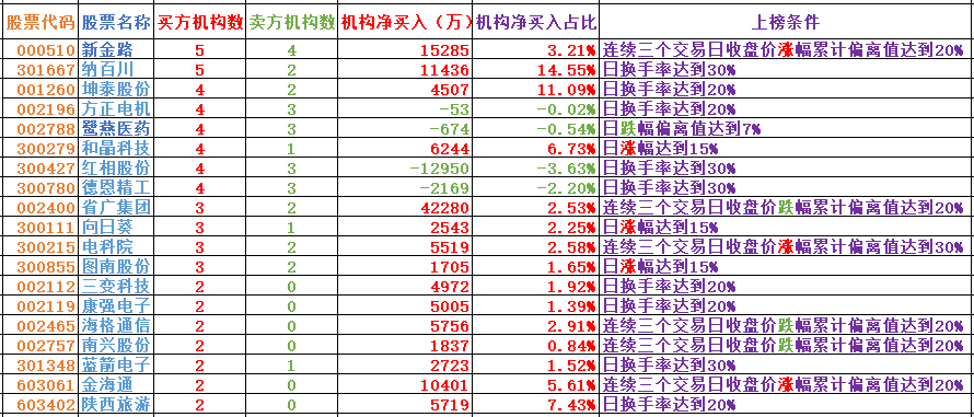 6.每日席位解读(主要是对个股的席位和软件指标进行一些解读,更好的理解席位的用法和软件信号,非荐股,对于机构席位大幅买入的品种,从逻辑上来讲是机构看好的预期,对这类品种需引起思考,对于选取做点评个股的逻辑主要是以下几点:机构净参与家数、机构席位净买金额、净买金额占比等)。