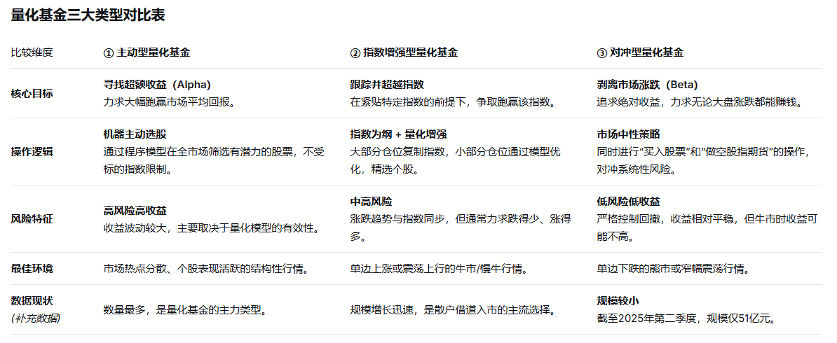 这里简单的小结:常见且相对成熟的有两种:主动型量化基金和指数增强基金