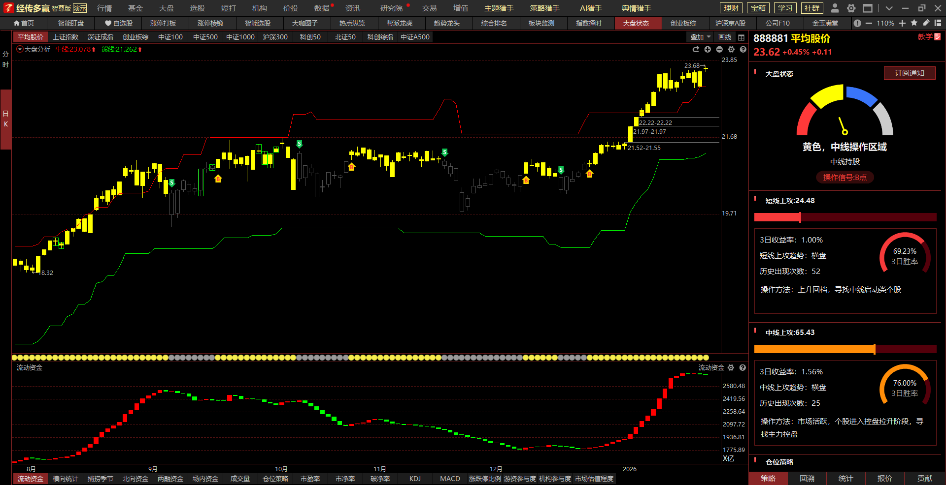 1.市场概况:周四两市延续反弹,几大指数集合竞价全线高开,开盘后快速冲高,之后震荡走低,几大指数先后翻绿,午盘前还是呈现翻绿状态,午后延续震荡态势,重心缓慢上移,最终几大指数全线上涨。截至收盘,上证指数报收4122.58点,上涨5.64点,涨幅0.14%,成交1.20万亿,深成指报收14327.04点,上涨71.92点,涨幅0.70%,成交1.49万亿;创业板指报收3328.65点,上33.13点,涨幅1.01%,成交6815亿。沪深两市今日合计成交2.69万亿,较上一个交易日放量910亿,平均股价流动资金连续2天翻绿。