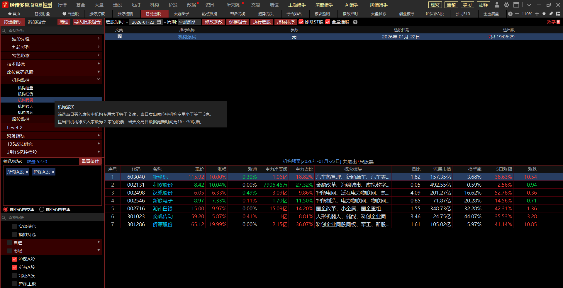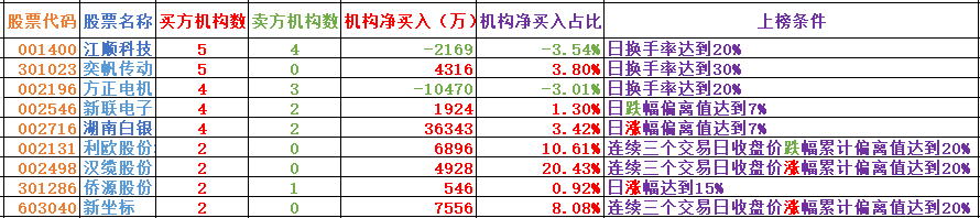 6.每日席位解读(主要是对个股的席位和软件指标进行一些解读,更好的理解席位的用法和软件信号,非荐股,对于机构席位大幅买入的品种,从逻辑上来讲是机构看好的预期,对这类品种需引起思考,对于选取做点评个股的逻辑主要是以下几点:机构净参与家数、机构席位净买金额、净买金额占比等)。