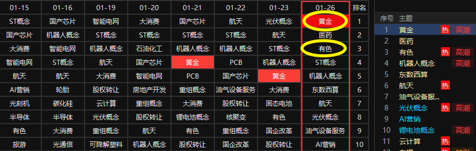 总结:其他指数今天下跌,上证指数护盘上涨,特备是上证50涨了1个多点,两市量能放大2000多亿,最近的盘面有资金在持续运作,特备是今天遇到指数即将调整,资金拉升白酒,金融。维稳市场的意图比较明显,有色方向高位震荡,不够白银有色为主的高位股继续涨停,表现的比较强。 而且黄金、白银价格还在创新高,还有上涨的动力,不过位置偏高了不适合追涨了,选股上可以选有色板块内部的不涨低位股,或者做做AI应用,半导体等其他低位方向。