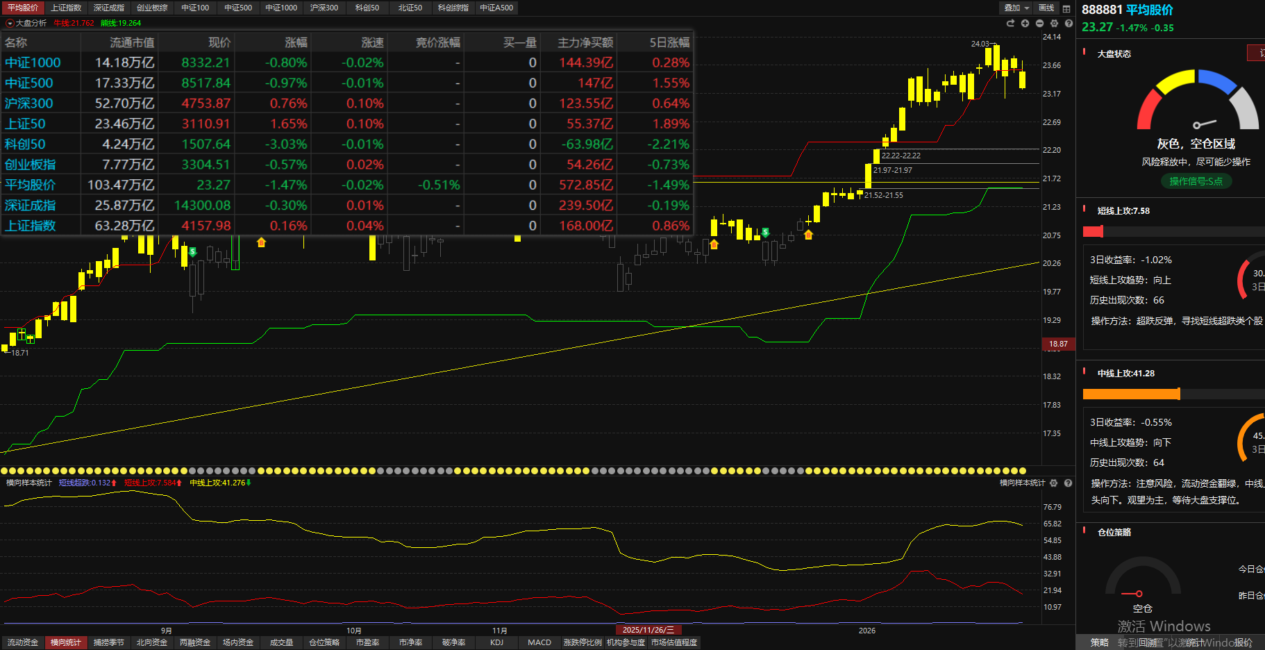 指数几乎普跌,表现最好的是上证50上涨了1.65%,表现最差的是科创50下跌了3.03%。 平均股价信号黄色B点、流动资金第5天翻红、牛线上移、熊线走平、中线上攻64.8向下、短线上攻19.5向下,捕捞季节死叉第4天。 两市量能放大2645亿。