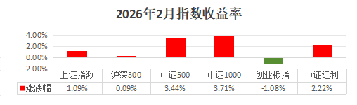 2月市场整体呈现震荡上行,上证指数上涨1.09%,来到4162.88点;大盘、小盘、中盘均录得正收益;从风格来看,小盘成长占据优势;红利股表现也较为不错。从行业来看,各大行业快速轮动,高低切换。