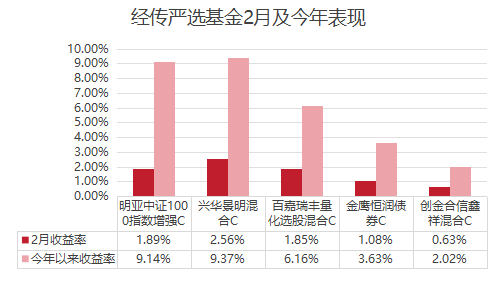 从整个2月表现来看,长钱、稳钱账户的严选基金都录得正收益,其中长钱兴华景明混合C、百嘉瑞丰量化选股混合C、稳钱金鹰恒润债券C、创金合信鑫祥混合C均再创净值新高。1月底贵金属大幅跳水,各大指数春节前震荡回调,我们的严选基金也遭遇了微小的回撤,对于那些在指数震荡回调逆势加仓的经传基金同路人,在春节后收到了市场给予的大红包。
