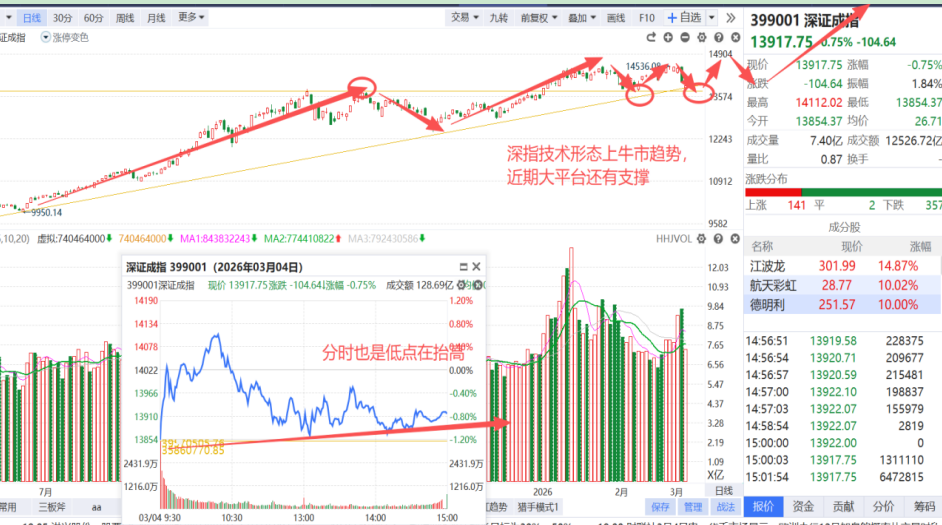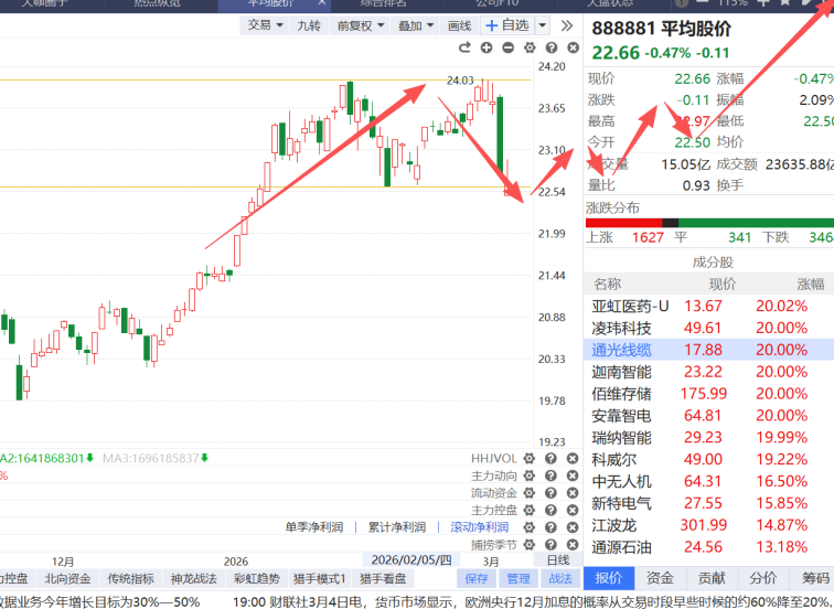 我们再看下三大指数,上证指数最强,主要是三桶油连续涨停;平均股价盘中跌破了2月2号大阴线的低点,不过收盘守住了这个低点;只有深证指数是均衡的,深证指数低点在不断抬高(盘中分时也没再创新低)。