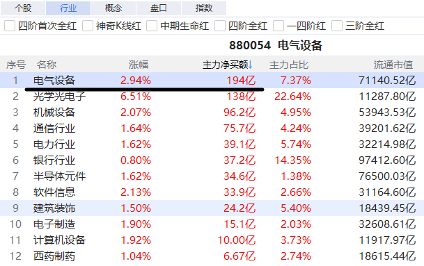 资金为王: 选股先看板块。电气设备板块今日主力净买额高达194亿,资金流入强度极大,板块效应明显,这是个股走牛的基础土壤。