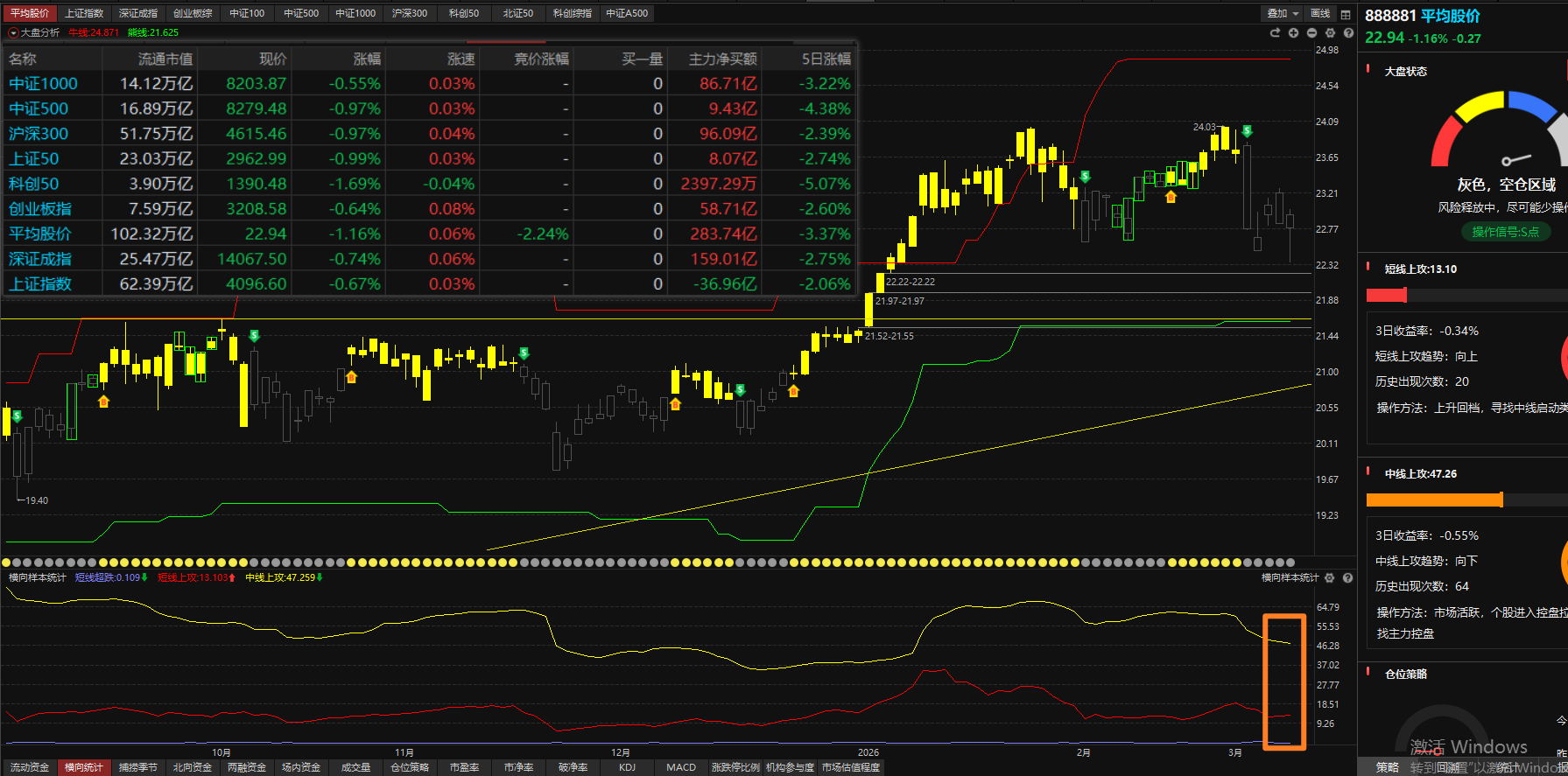 指数普跌,表现最好的是中证1000下跌了0.55%,表现最差的是科创50下跌了1.69%。 平均股价信号灰色S点、流动资金第1天翻红、牛线走平、熊线走平、中线上攻47.2向下、短线上攻13.1向上,捕捞季节金叉第2天。 两市量能放大4473亿。