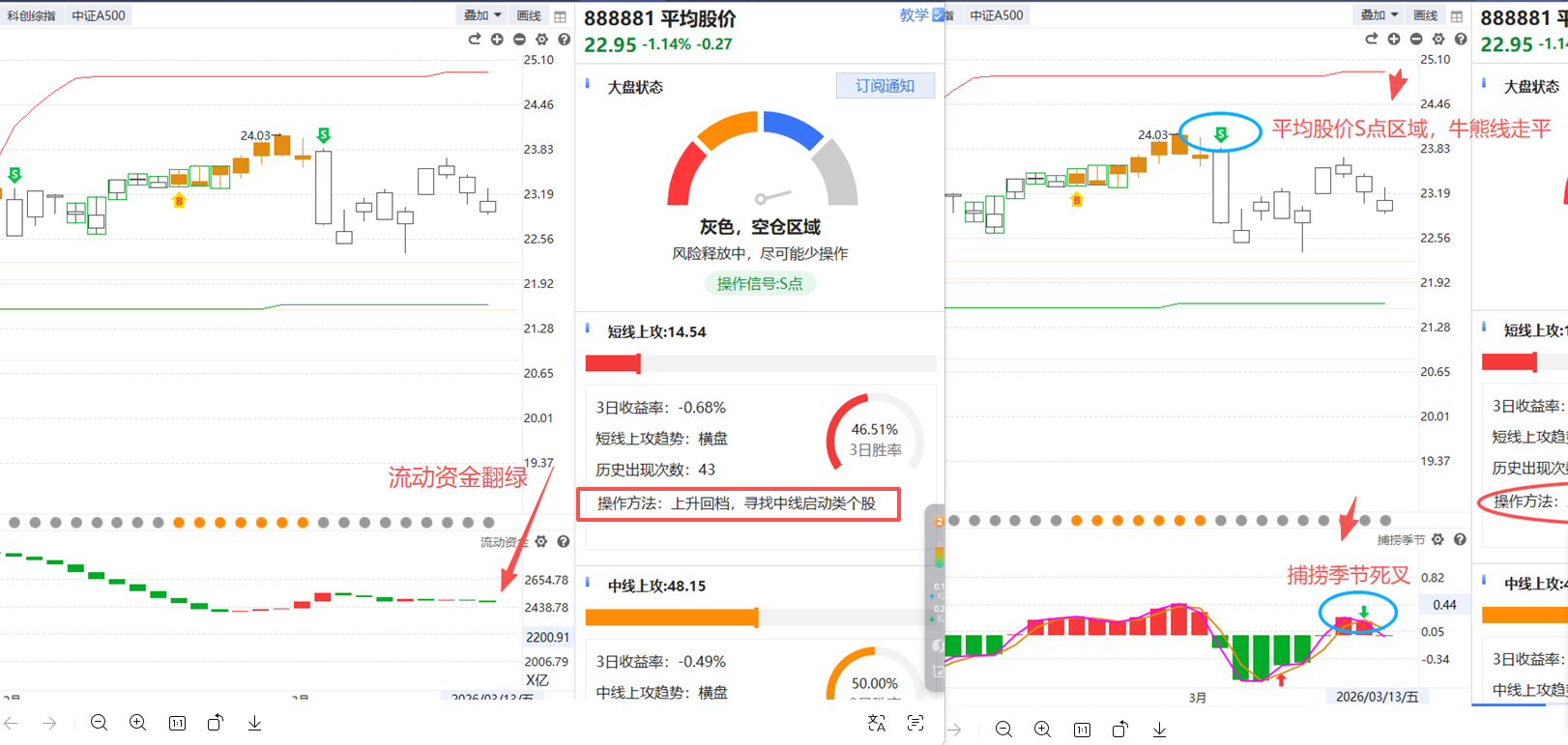 从平均股价来看,目前处于S点风险区域,牛熊线走平,震荡洗盘形态,流动资金持续翻绿,捕捞季节死叉调整第2天,注意个股仓位控制,耐心等待金叉止跌反弹,仓位建议:1-2成或空仓观望为主,策略选择:高抛低吸!