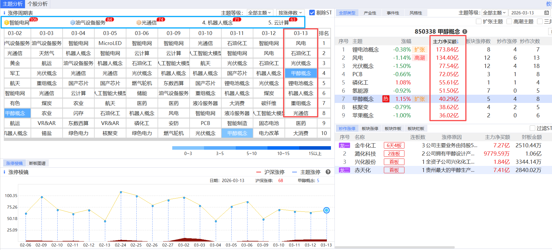 近期板块轮动比较快,持续性相对较好的是:智能电网,光通信,云计算 等方向,目前纷纷进入分歧调整阶段,从涨停棱镜上看,周五风电,锂电池概念,甲醇概念,化工方向表现是比较不错的!不过受到大盘跳水情绪的影响,抛压是比较大的,主题资金流入如下图所示: