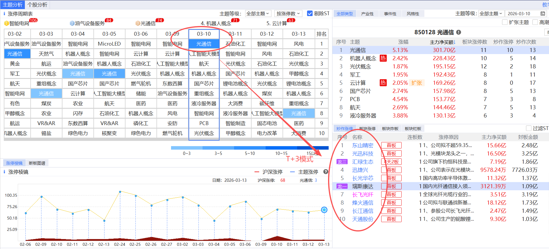 根据涨停棱镜T+3模式来看,3-10光通信处于高潮,可以重点筛选3.10涨停个股, 如东山精密,汇率生态,长飞光纤,迅捷兴,光迅科技等!