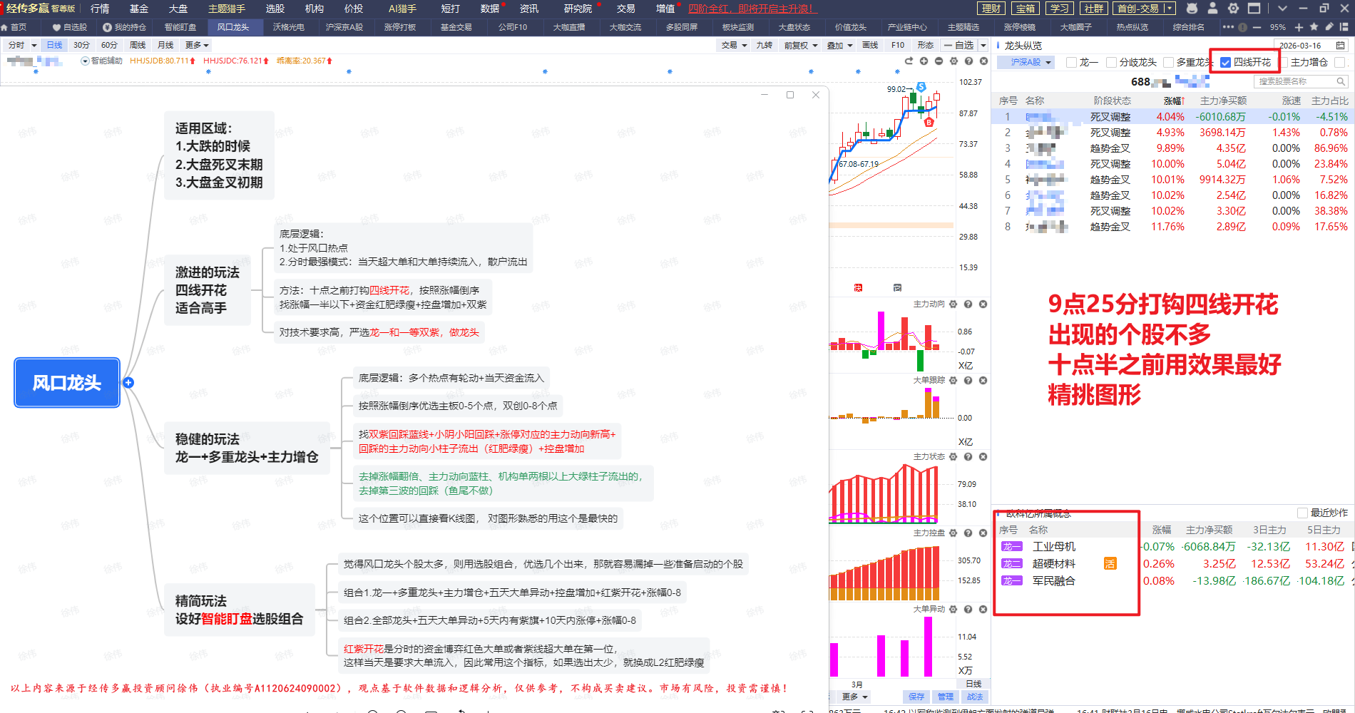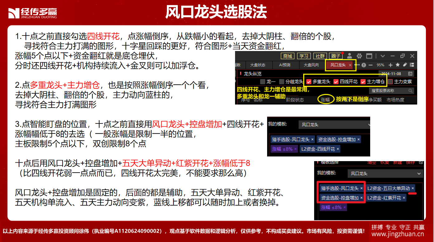 风口龙头顾名思义就是市场当前最强的风口,而且都是龙头股,多重龙头,就是多个热点的龙头, 一般是在早盘使用效果最好,下午选的就挑图形了,符合的标的也会少很多。