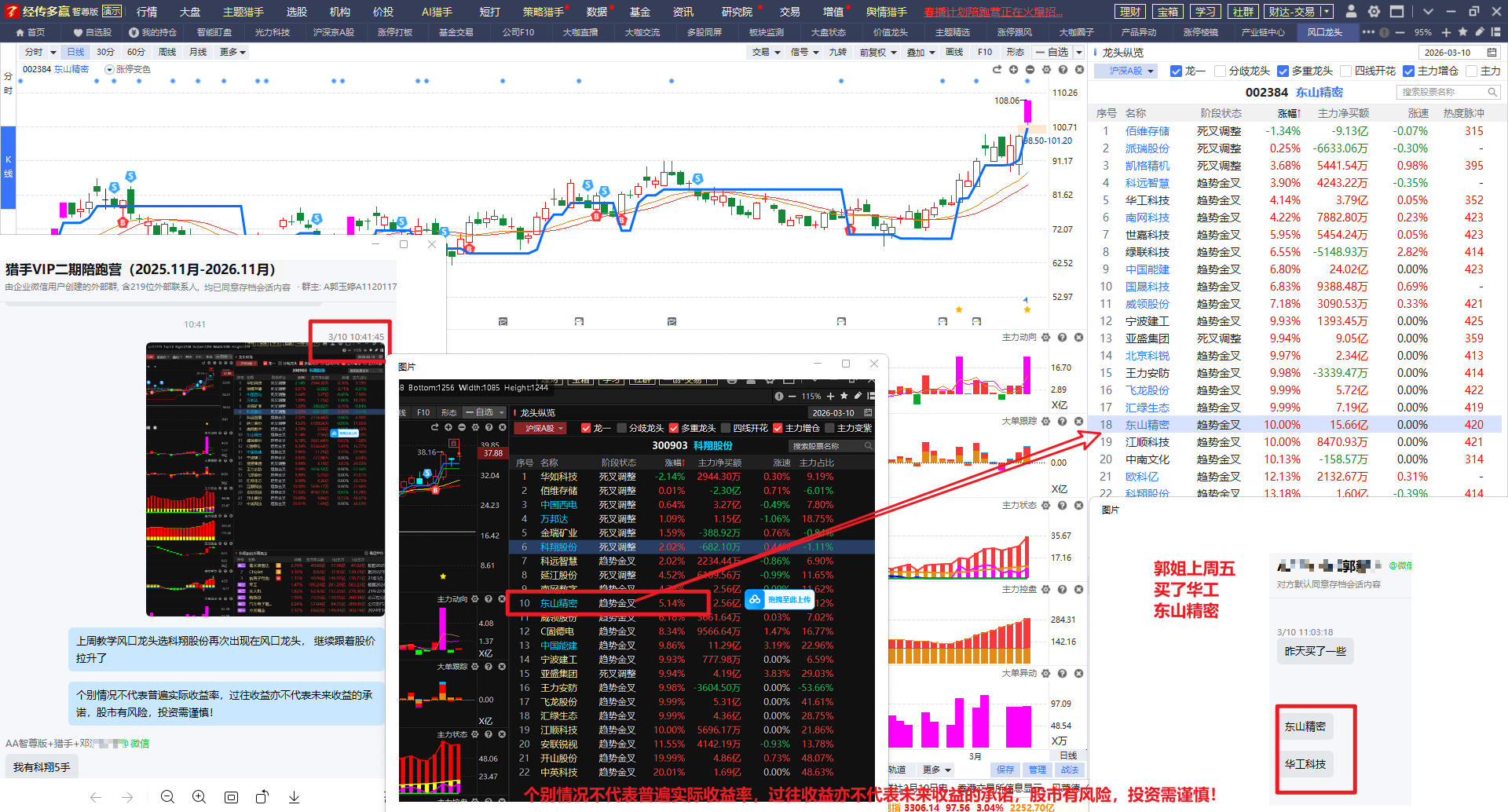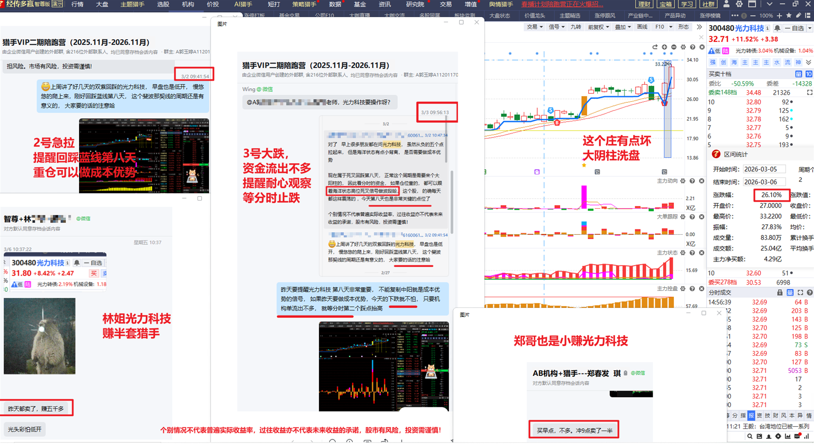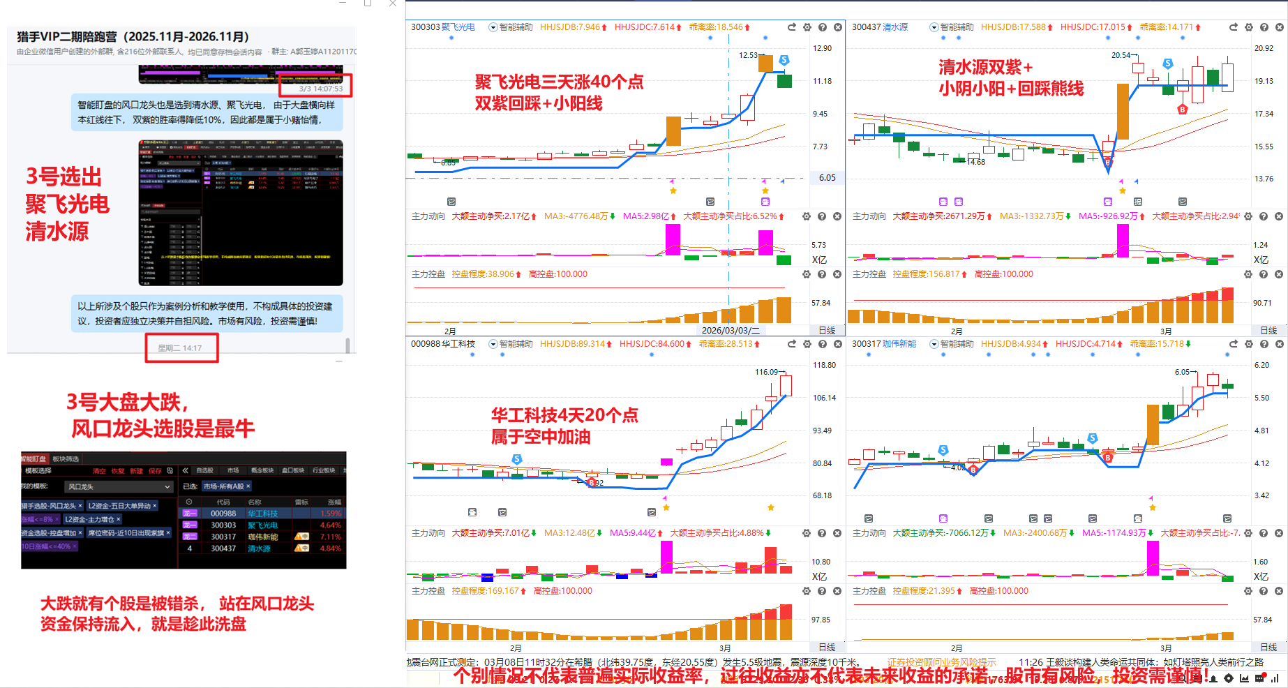 如2026.03.03大盘大跌, 提醒大家非常适合去选股, 用风口龙头智能盯盘选出四个股, 聚飞光电3天涨38个点,华工科技4天涨20个点,清水源4天涨9个点,嘉伟新能3天18个点,四个涨幅都不错,