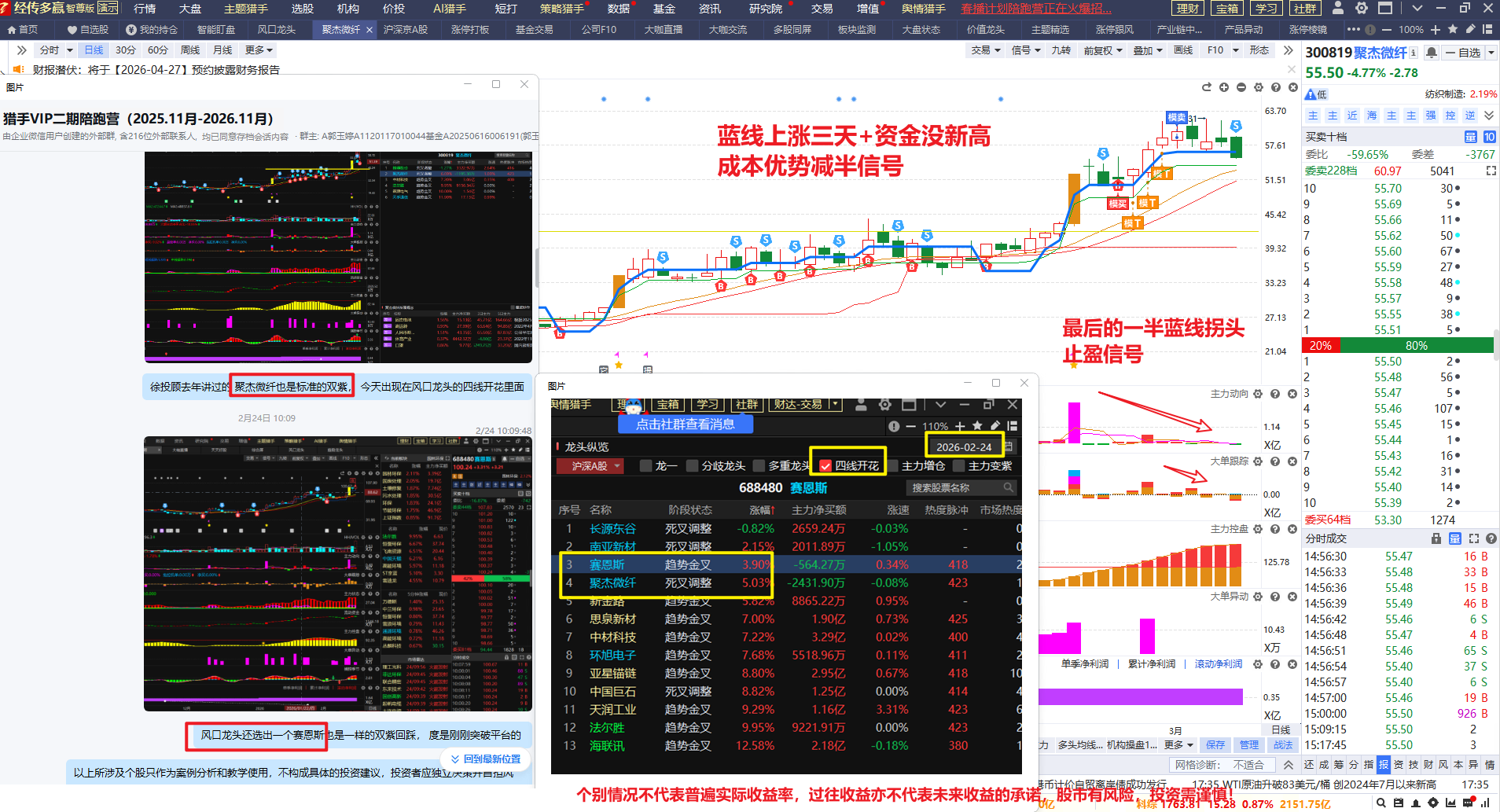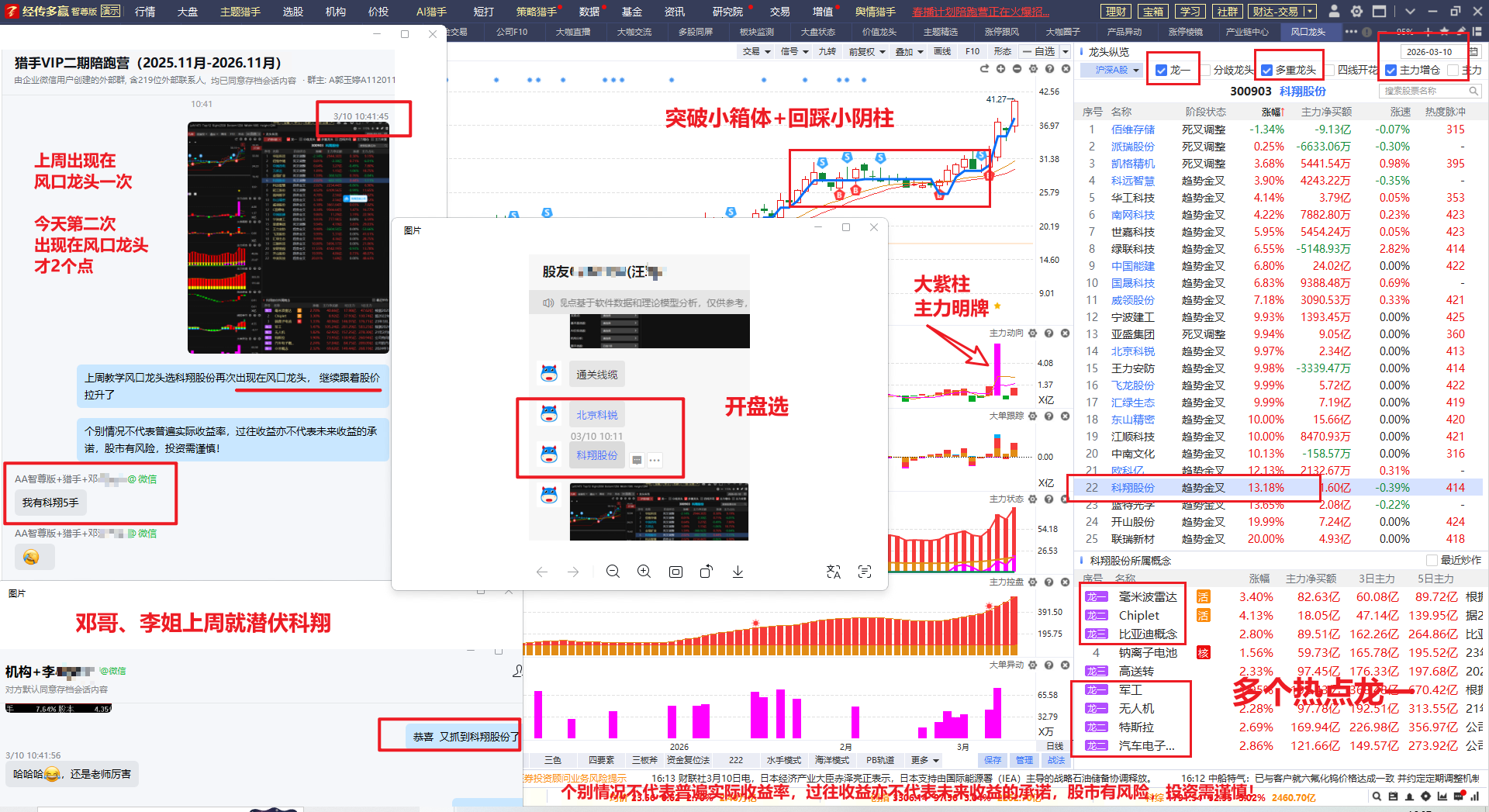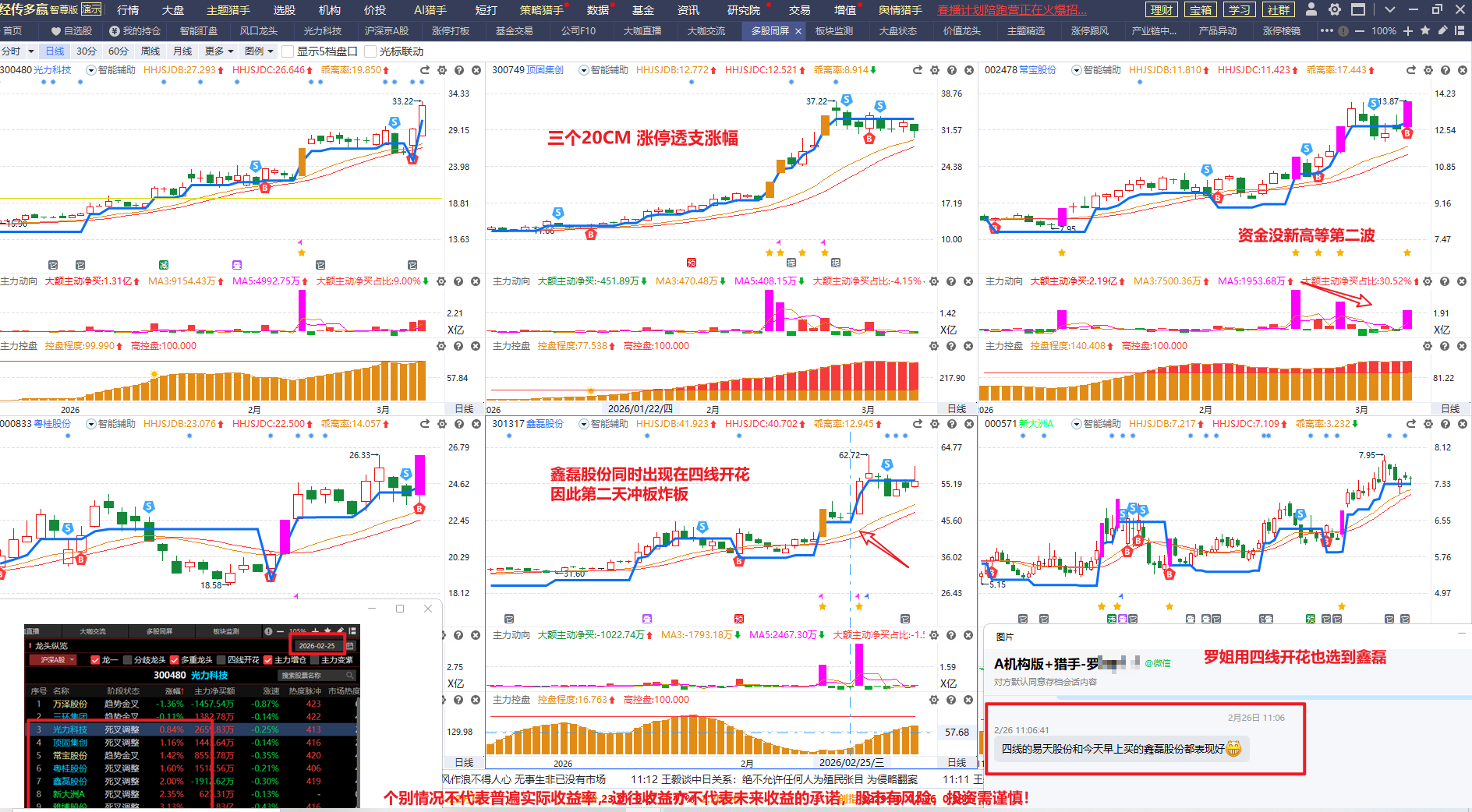 如2026.03.03大盘大跌, 提醒大家非常适合去选股, 用风口龙头智能盯盘选出四个股, 聚飞光电3天涨38个点,华工科技4天涨20个点,清水源4天涨9个点,嘉伟新能3天18个点,四个涨幅都不错,