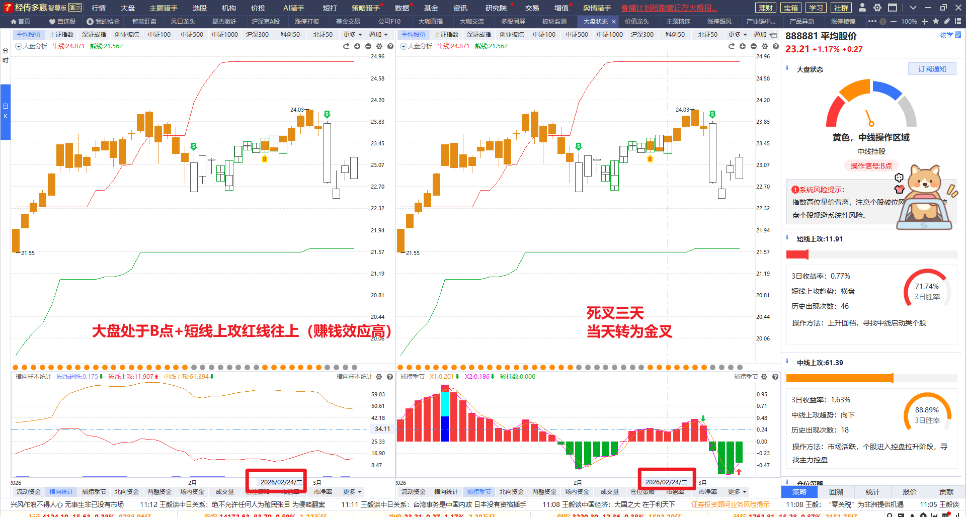 如2026.02.25号大盘仍然处于B点+横向样本短线上攻红线上移+金叉区域, 这个时机也是非常好,