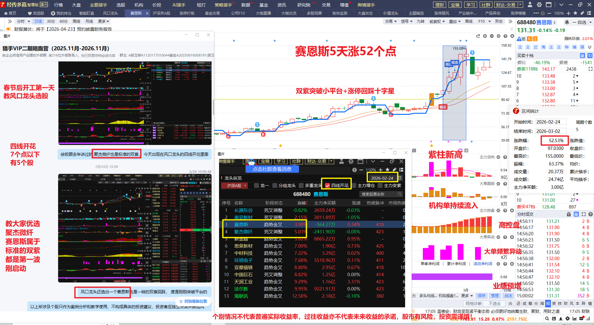 双紫回踩蓝线,十字星,主力动向小柱子流出+控盘增加, 特别是刚突破小平台, 这种大概率是洗盘, 这也是为什么赛恩斯最后走得最强,当时也是实时在陪跑营用模拟盘教学三买三卖原则, 也是直播了五天。