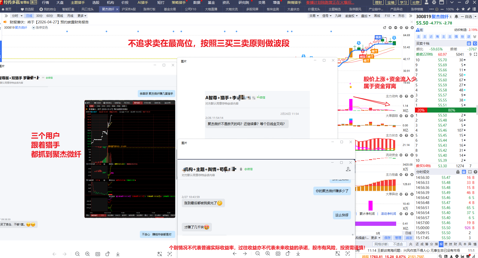 曾哥操作的第一个风口龙头的易天股份也是这样的模式, 强者恒强, 做T+1 第二天及时止盈, 快准狠,风口龙头选股是非常快, 基本都是属于主线热点、资金配合就回起飞很快,不如华工科技虽然也是资金背离, 但是他更多是风口+情绪拉升,这也是为什么曾哥只选聚飞光电的原因, 重在二次筛选,锁定最强的龙头股。