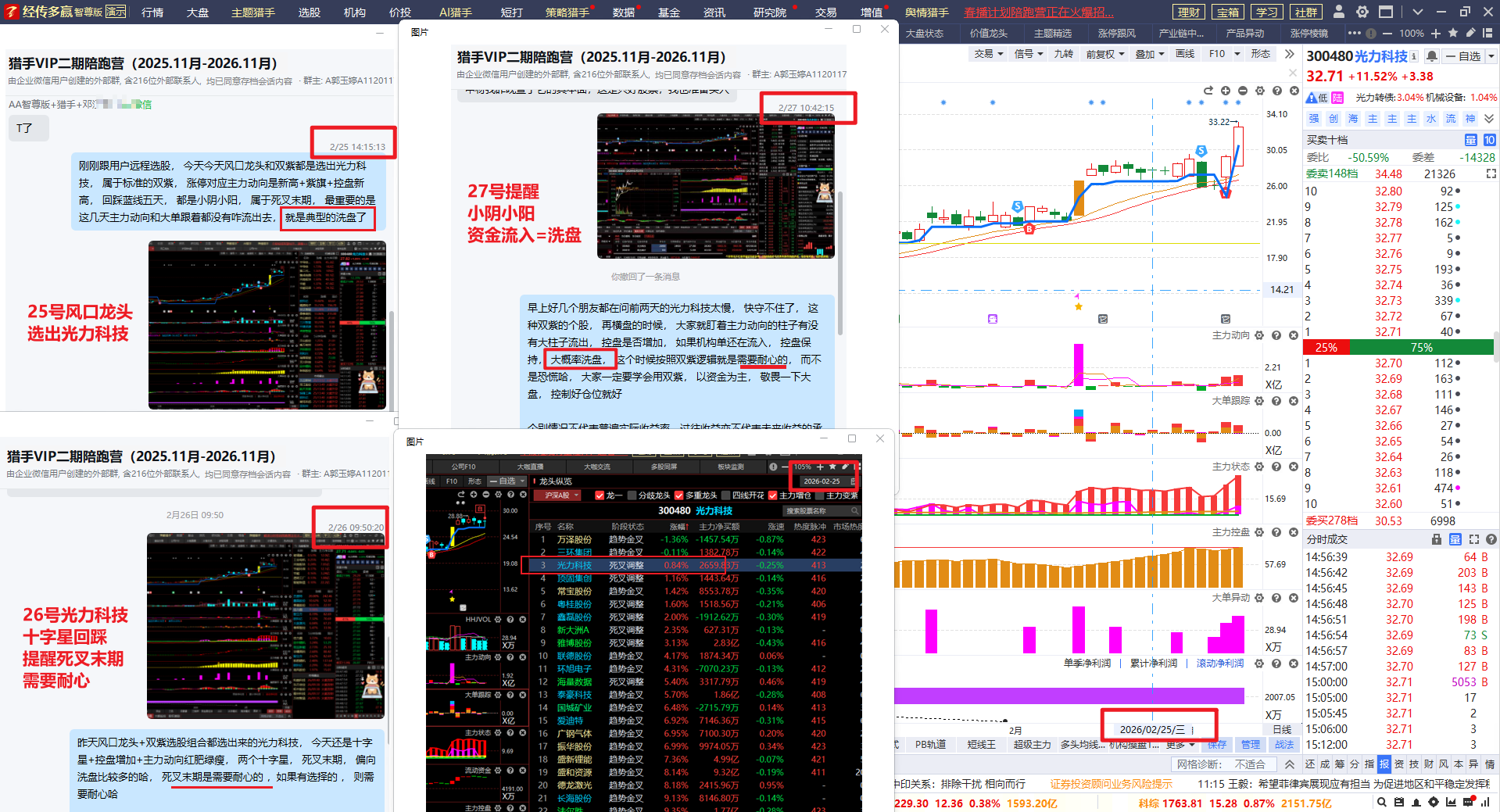 当时还叠加了双紫的智能盯盘重叠选出就一个光力科技是最符合一等双紫,小阴小阳回踩+资金流入。这个庄也是非常会洗盘, 在回踩蓝线第八天还故意来根大阴柱洗盘是洗得够狠的, 不过在回踩的时候群里都有提醒偏向洗盘比较多, 最好两天也拉升26个点