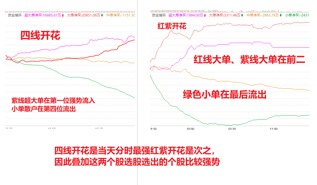 一、四线开花:开盘十点半之前都可以用, 最好是十点之前, 直接打钩四线开花,按照涨幅倒序,优选第一波双紫