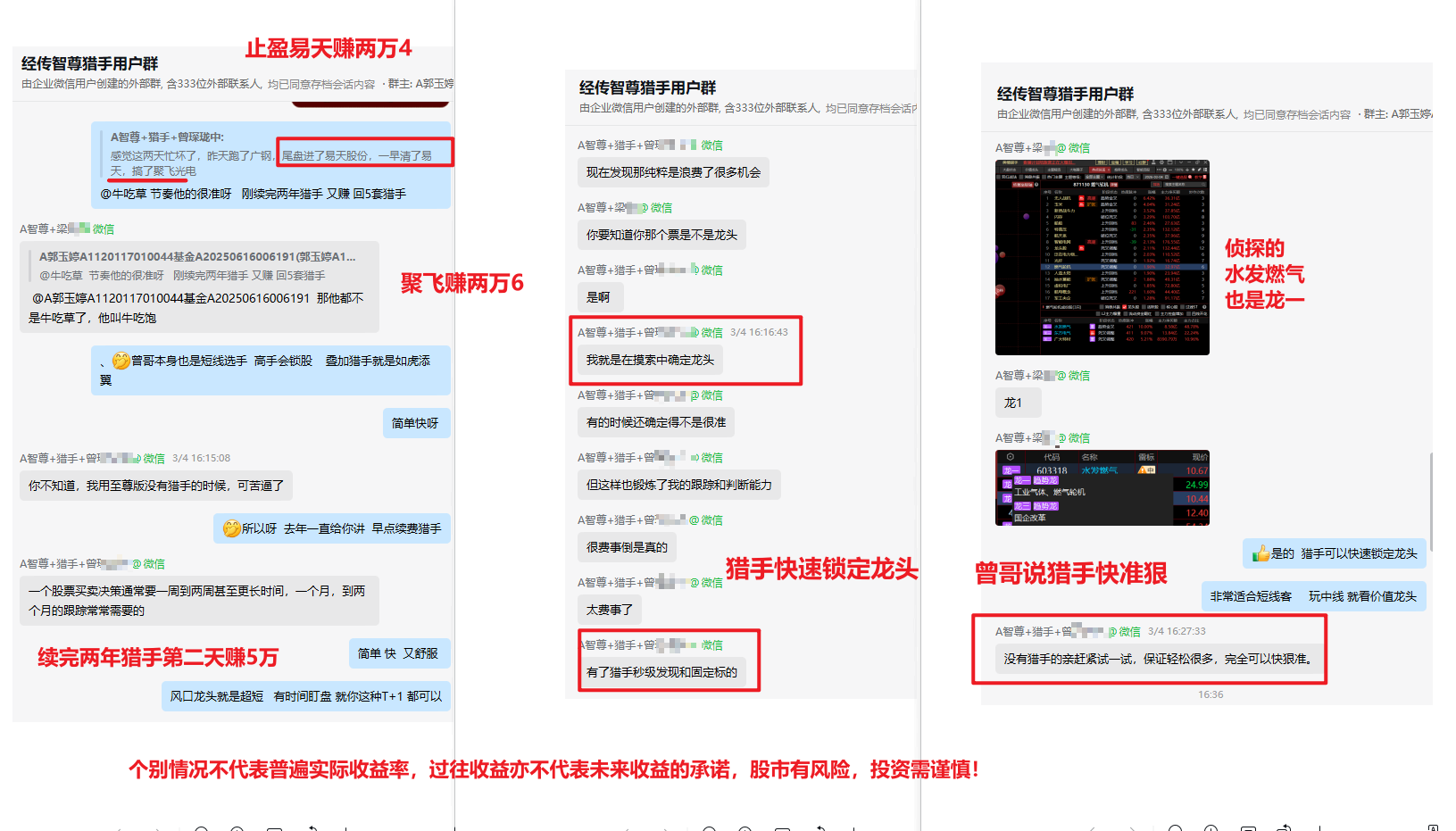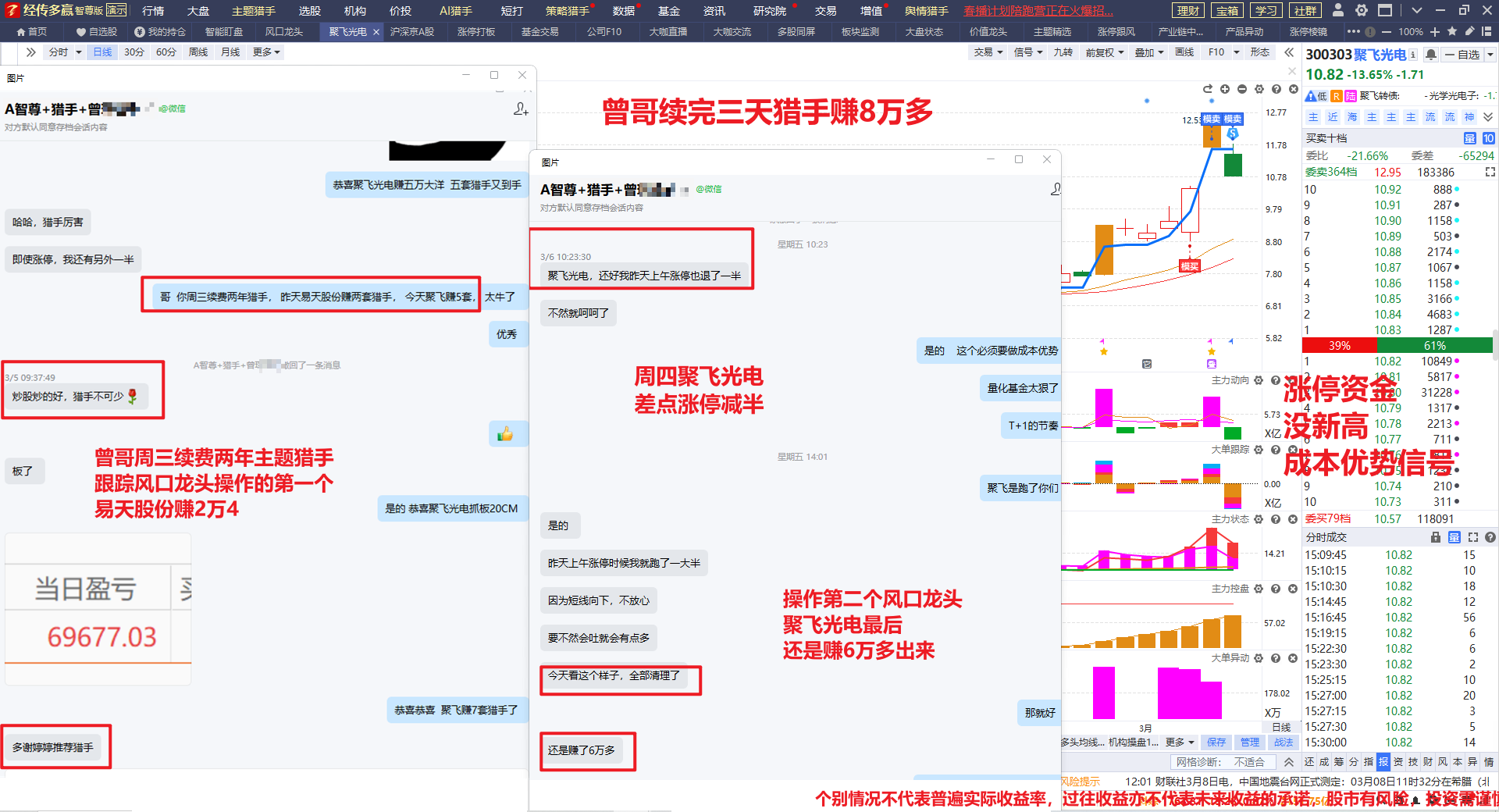 为什么当时四个就选了聚飞光电,第一这个回踩蓝线都是小阳线,资金更强势一点, 恭喜曾哥续费两年猎手后, 三天赚8万多,一直夸猎手快准狠, 省去很多功夫。