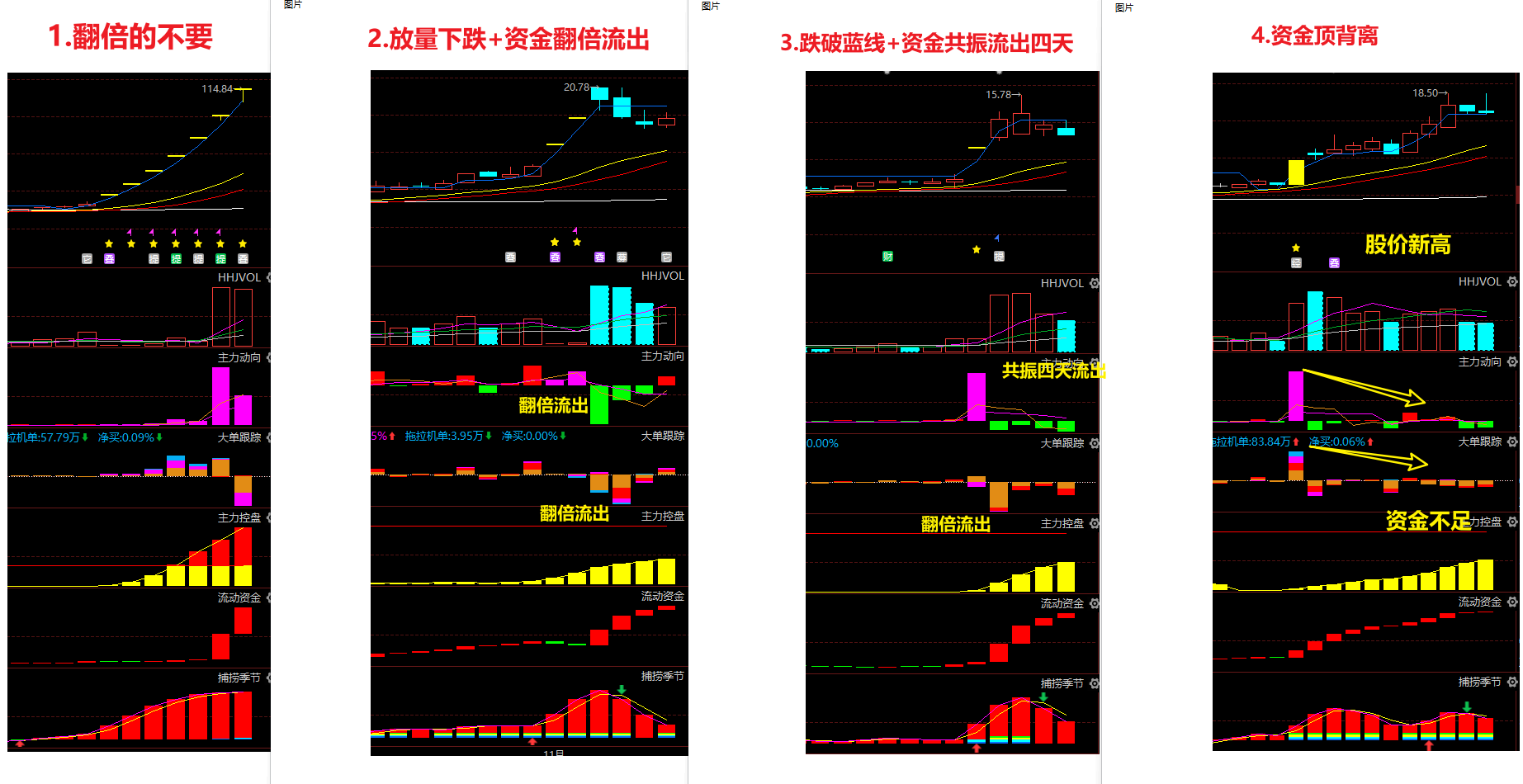 回头看当时风口龙头选的0——3个的6个股, 顶固是因为3个20CM 涨停已经透支涨幅, 这种图形一般是淘汰, 新大洲一直跟着蓝线上涨+资金背离也是可以淘汰,