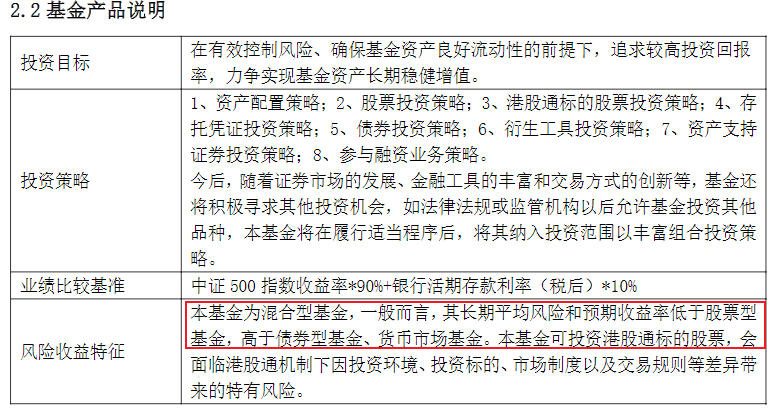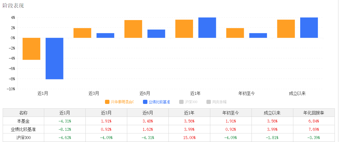 如下是兴华景明混合C的基金产品说明,其风险收益特征可以看到基金为混合型基金,其长期平均风险和预期收益率低于股票型基金,高于债券型基金、货币市场基金。