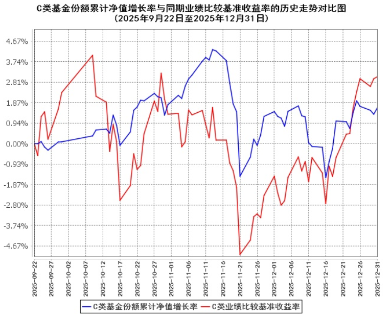我们可以看到该基金自2025年9月22日成立,在基金合同生效日起前6个月为基金的建仓期,截至该基金2025年年度报告期末,该基金还处于建仓期。我们也可以从下图中看到兴华景明作为混合型基金,它的高收益率后面同时也伴随了高风险,对于长钱账户持有兴华景明混合C的投资者可以很明显的感受到这点,在持有的过程中其净值波动相对来说还是比较大,其净值的修复速度也相对较快。对于积极型、激进型投资者来说,如果能承受较大的亏损,可以在长钱账户账户中多配置兴华景明混合C作为成长的进攻型选手,对于相对稳健的投资者尽量降低长钱账户兴华景明混合C的占比,更多的考虑稳钱账户的固收+创金合信鑫祥混合C。