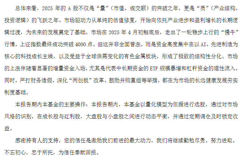 从报告期内基金的投资策略和分析,我们可以看到市场的驱动力从单纯估值已经逐步转向产业进步和企业盈利增长的长期逻辑过渡,我们也可以看到其量化的方向为识别市场的风格,在成长股和红利股、大盘股和小盘股之间进行动态平衡,而非单压某个行业或者赛道的个股,其实这对我们个人投资者在做资产配置也是很有启发的点,投资赚钱的时候自己是否有一套资产配置体系,为什么赚钱?为什么亏钱?市场波动自己账户大幅亏损,是否持仓过于集中或者没有做定期的再平衡锁定收益?