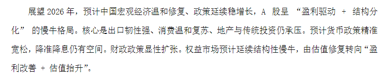 最后,我们一起来看一下管理人对宏观经济、证券市场和行业走势的展望。我们可以看到A股呈现“慢牛”的格局还在,2026年更加倾向于估值修复转向“盈利改善+估值抬升”。