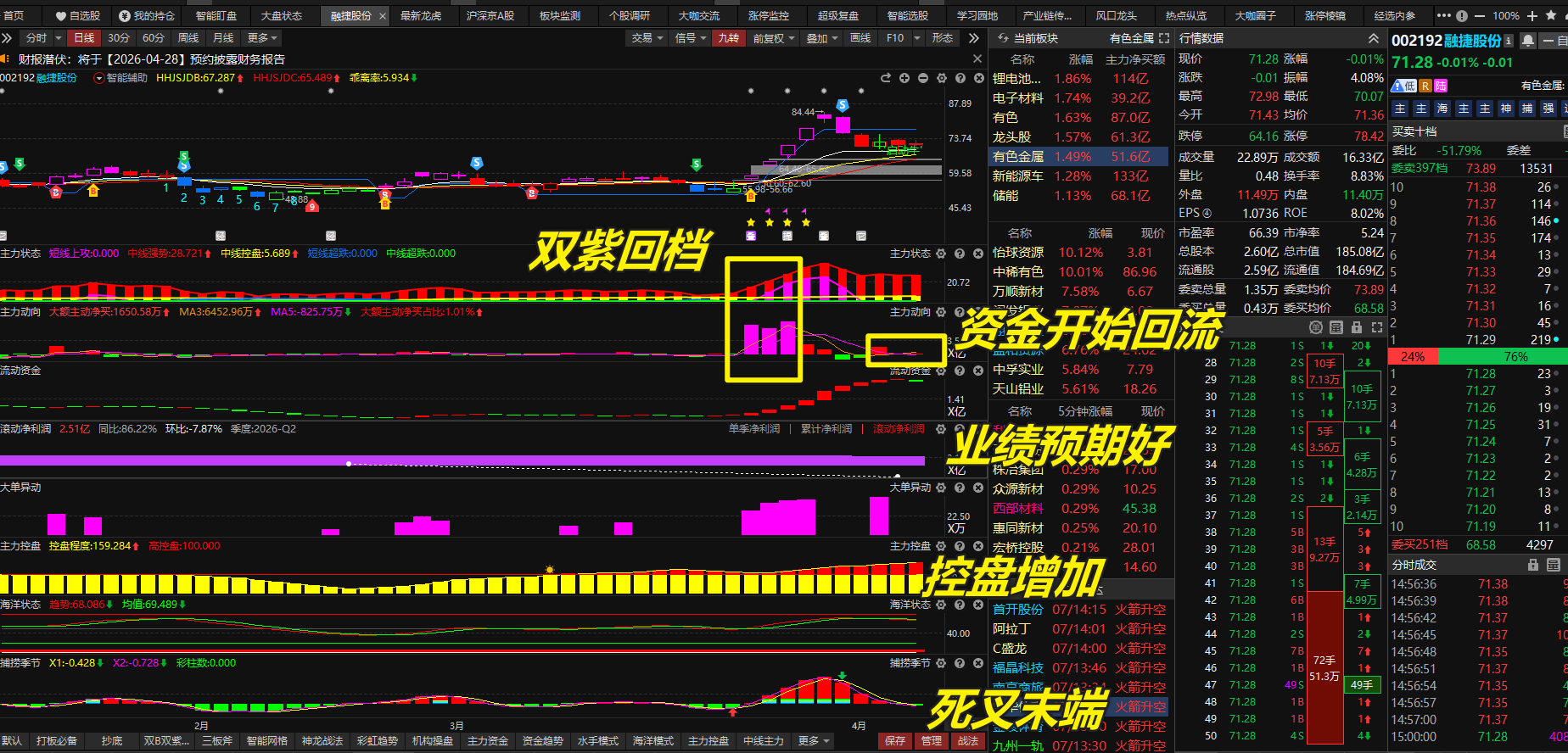 选出融捷股份(002192)符合双紫回档,业绩预期好,控盘增加,双紫回档后资金开始回流,先看BBI支撑,两个剧本走: 剧本①死叉末端,金叉出现,是买点机会,金叉出来后反弹遇到蓝线压力不及预期,则要高抛止盈,短线2-3天不表现则要考虑离场; 如果金叉出来后,有突破蓝线B点,则看能不能有蓝线上移机会,有蓝线上移继续看强。 剧本②:金叉迟迟不出来,回档时间过久,比如8-10天还没出来金叉的,则要视为该强不强 就要走弱了,不要硬上。注意回档过久的不适合左侧埋伏,一定要等金叉出来后再考虑,而且要设置好止损位,回档过久的都不属于强者恒强的。快进快出为主。 以上所涉及个股只作为案例分析和教学使用,不构成具体的投资建议,投资者应独立决策并自担风险,市场有风险,投资需谨慎!