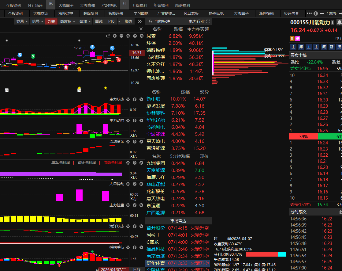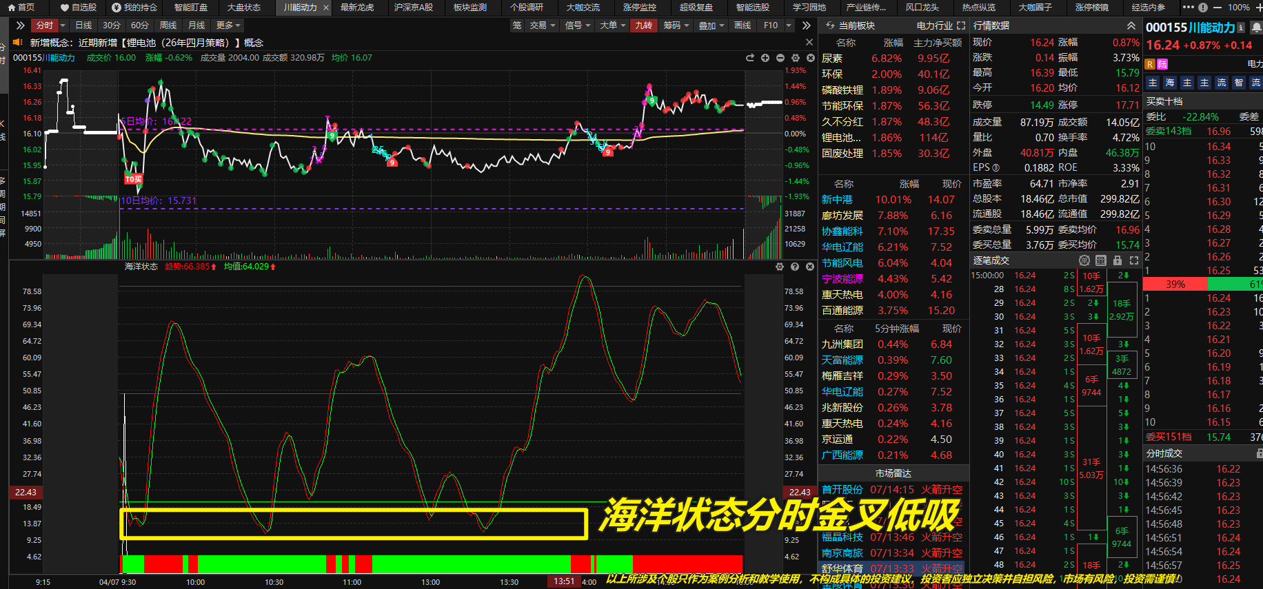 选出川能动力(000155),目前死叉末端,控盘攀升,滚动净利润业绩预期好,符合双紫回档,目前有B点,留意金叉出现。两个剧本:①如果明天出现S点则要再观察一下,等跌出阴线再看。 剧本②:B点维持,金叉出现,则看金叉反弹机会。注意看分时有没有支撑和站稳,单边下行分时 需要 下午快收盘后再看,如果是上行分时,则结合资金,和分时海洋状态 低位金叉。 注意看两种不同的情况,如果后续不及预期,设置好止损位,考虑清楚哪里是卖点,一般涨停封住多看一天,如果不涨停,持股3天的,可以考虑分时海洋状态 高位死叉高抛,短线不能恋战。 以上所涉及个股只作为案例分析和教学使用,不构成具体的投资建议,投资者应独立决策并自担风险,市场有风险,投资需谨慎!